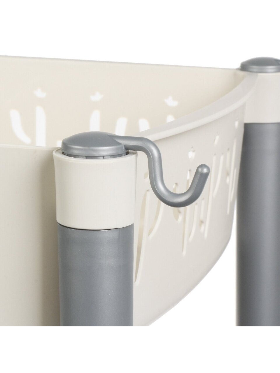 Эта полка предназначена для напольного размещения и не требует крепления, что позволяет легко перемещать ее по дому. Прямоугольная форма и наличие бортиков обеспечивают безопасность хранения, предотвращая падение предметов. Четыре крючка добавляют дополнительное пространство для размещения вещей, что делает эту полку действительно универсальной.