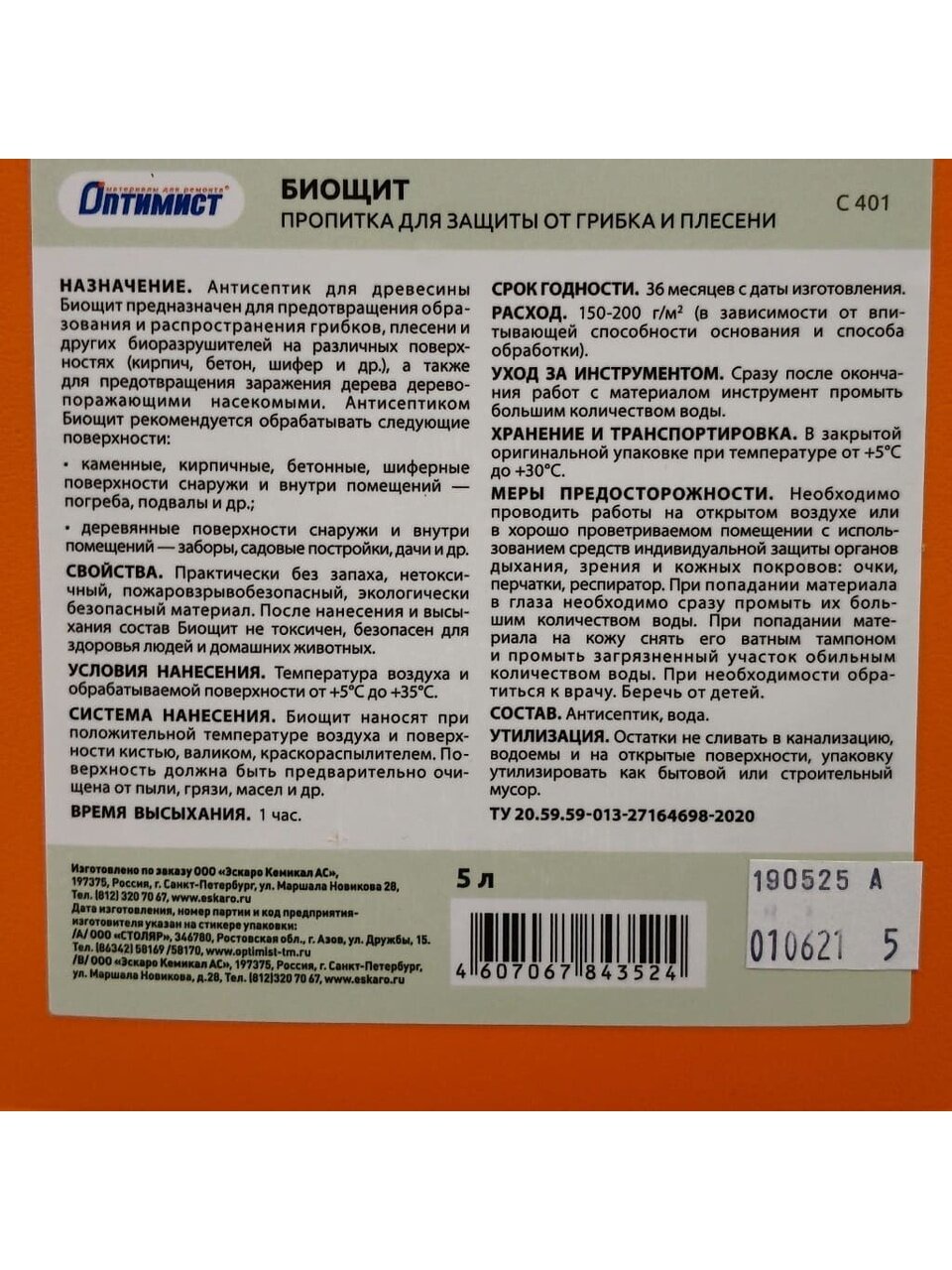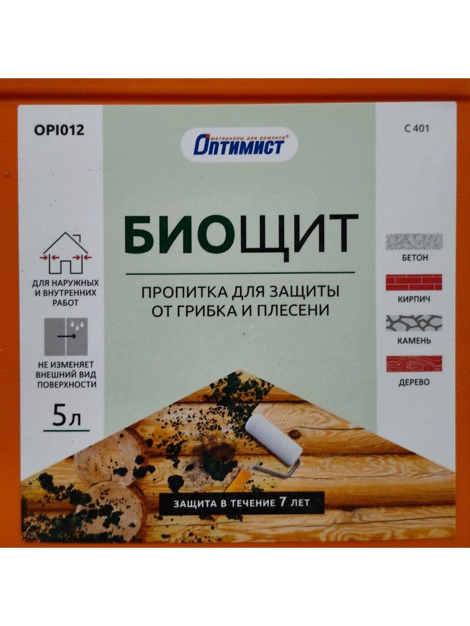 Пропитка «Биощит» С401 предназначается для предотвращения образования и распространения грибков, плесени и других биоразрушителей на различных поверхностях (кирпич, бетон, шифер и другие); а также для предотвращения заражения дерева насекомыми-паразитами.