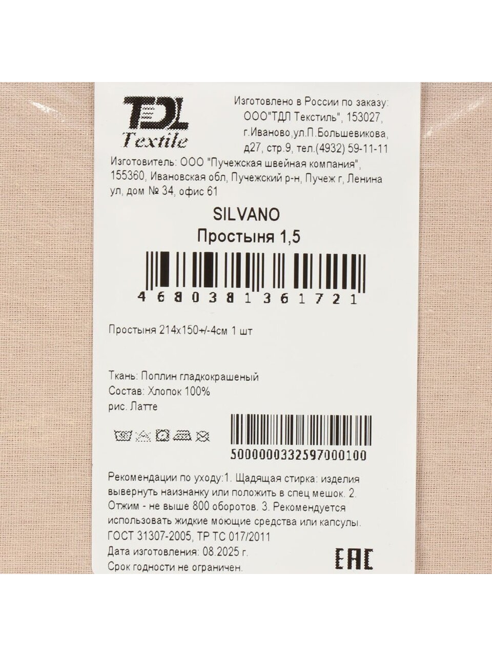 Простыня 1.5-спальная, 150 х 214 см, 100% хлопок, поплин, Silvano, Латте - фото 1 от пользователя