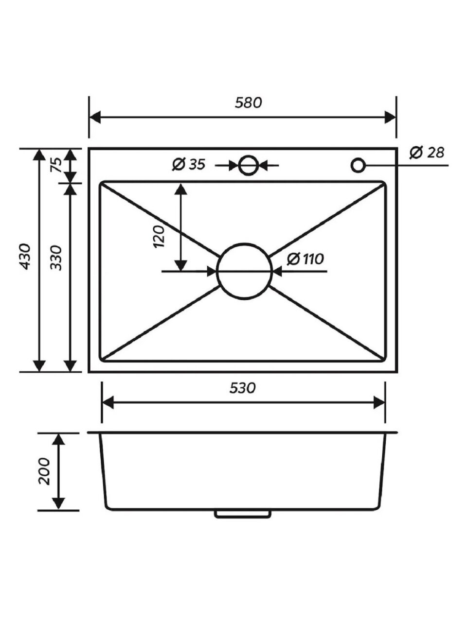 - Диаметр слива: 110 мм.