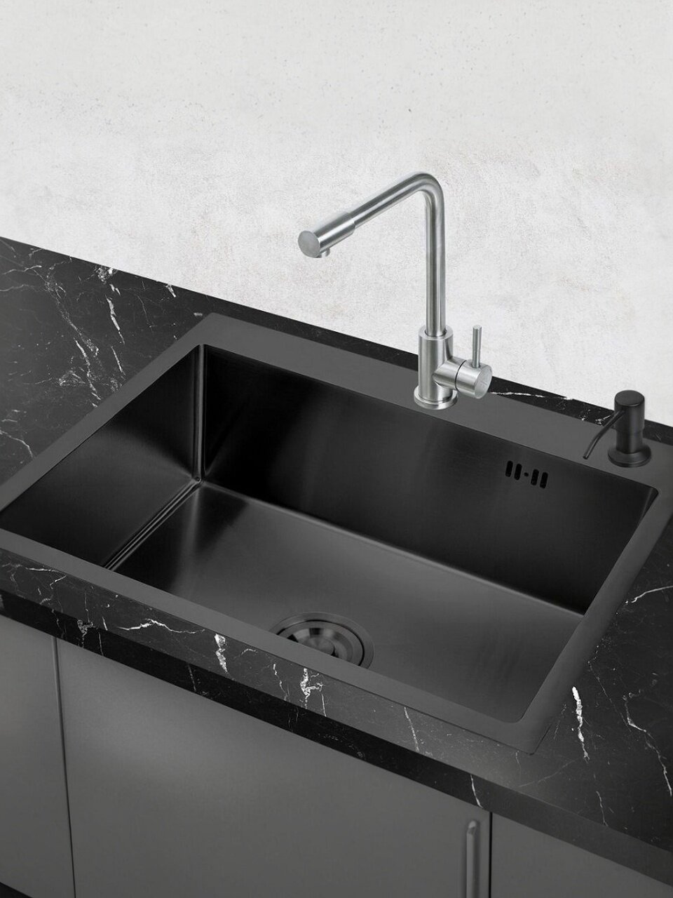 Набор: мойка, дозатор врезной, корзина раздвижная из нержавеющей стали для сушки, сифон высокого качества с гофрой с универсальным выходом 40/50, заглушка для отверстий, корзинка для отходов при сливе.