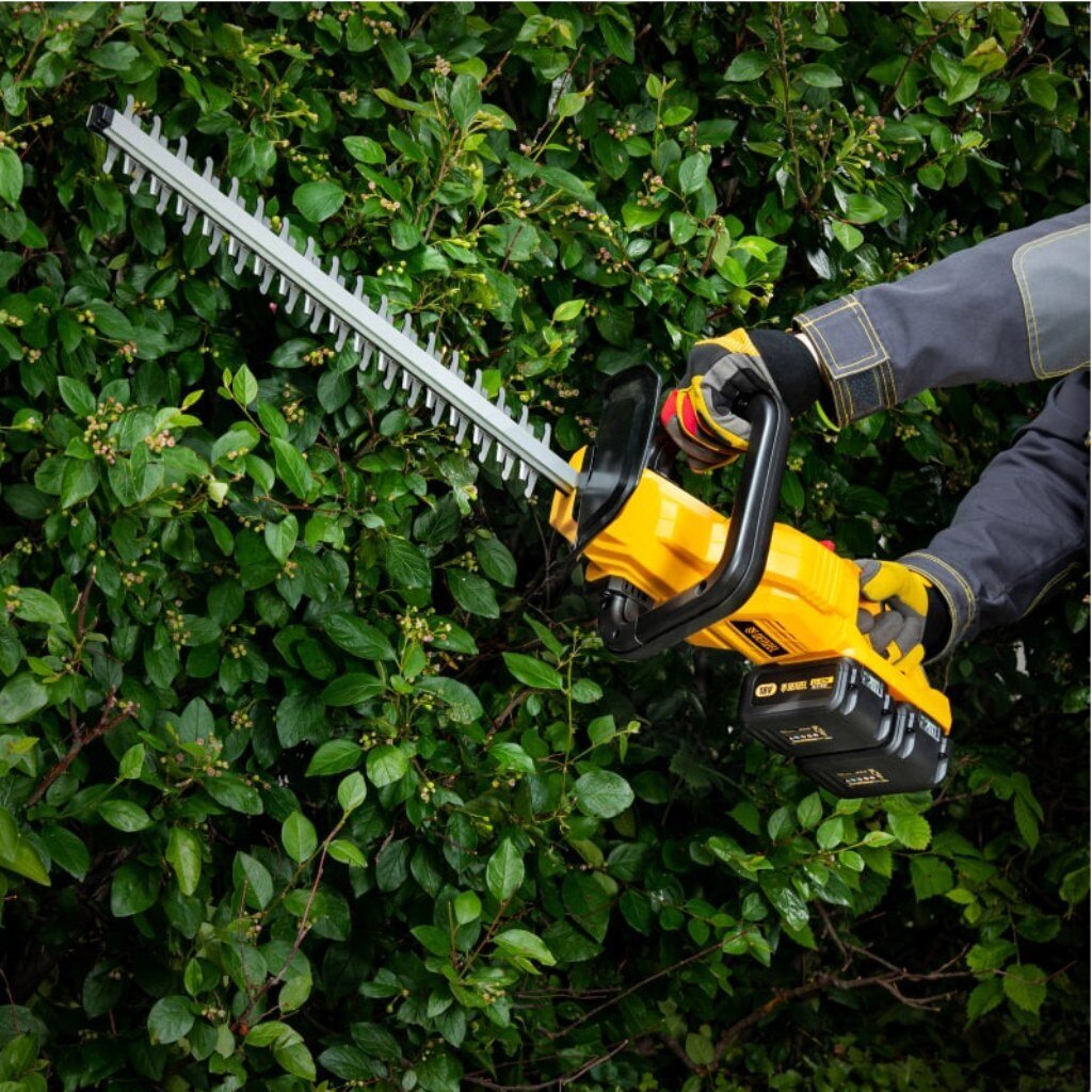 Аккумуляторный кусторез Denzel RBC510-36 59410 с двумя Li-Ion батареями емкостью 4 Ач и суммарным напряжением 36 В, с поворотной ручкой, используется для стрижки кустарников и тонких веток деревьев, подрезания дикой поросли травы. С его помощью можно создать живую изгородь или ландшафтные скульптуры из декоративных растений. Нож длиной 510 мм обеспечивает толщину реза 24 мм.