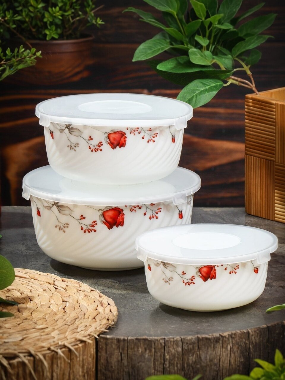Салатники Daniks Вероника из стеклокерамики: набор из 3 круглых мисок с крышками (0.5/0.8/1.4 л), стиль прованс, прочность и универсальность для дома и дачи.