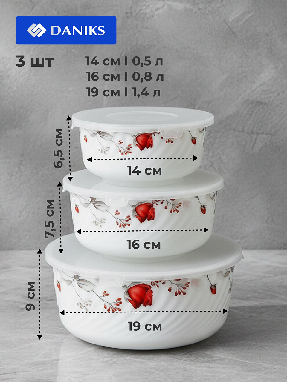 В набор входят три салатника: 14 см (0.5 л), 16 см (0.8 л), 19 см (1.4 л), все с крышками. Высота каждой миски — 9 см.