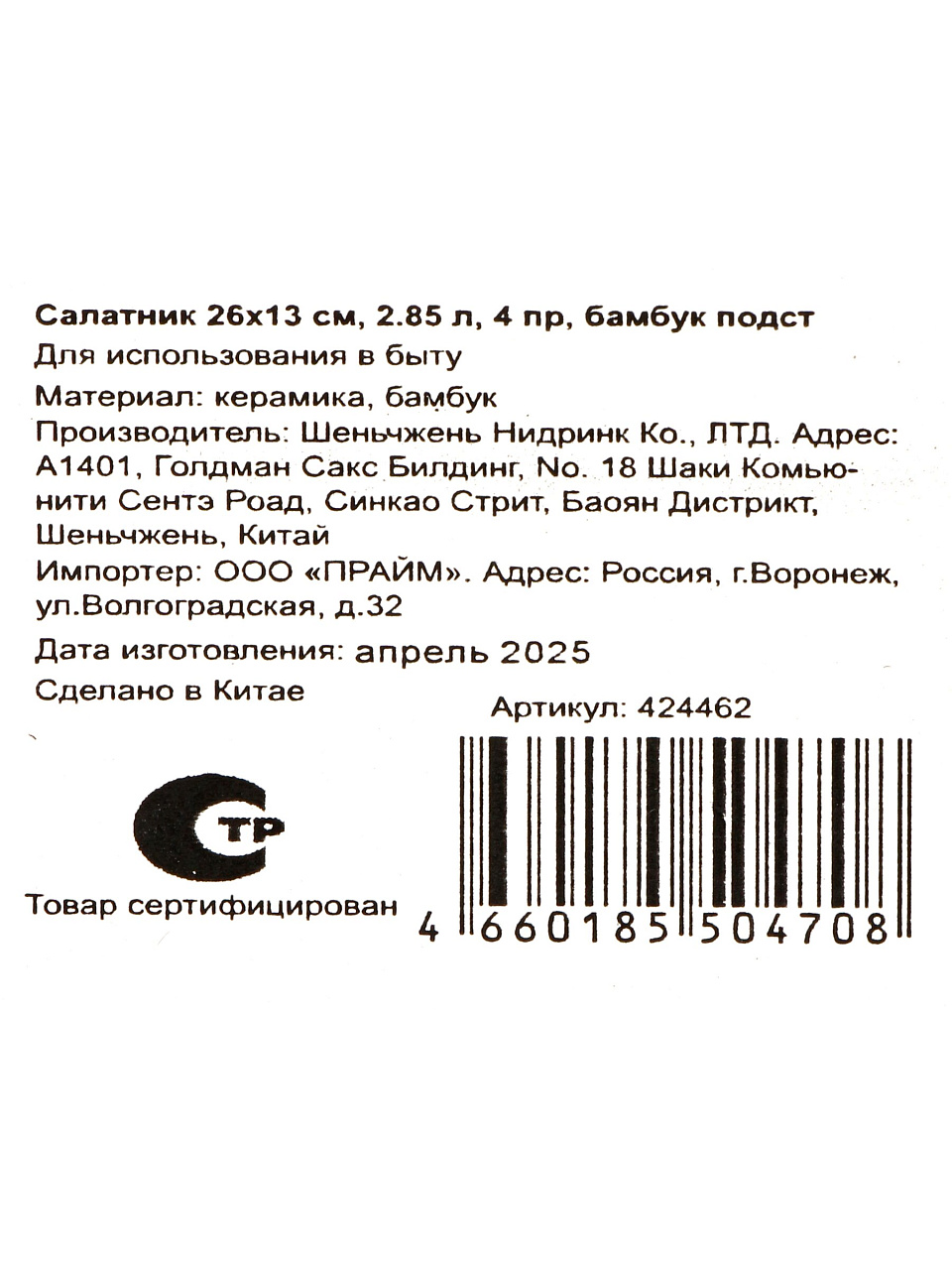 Объём салатника — 2.85 литра, размеры: 26 см в длину, 13 см в высоту, квадратная форма. Комплект состоит из 4 предметов на бамбуковой подставке.