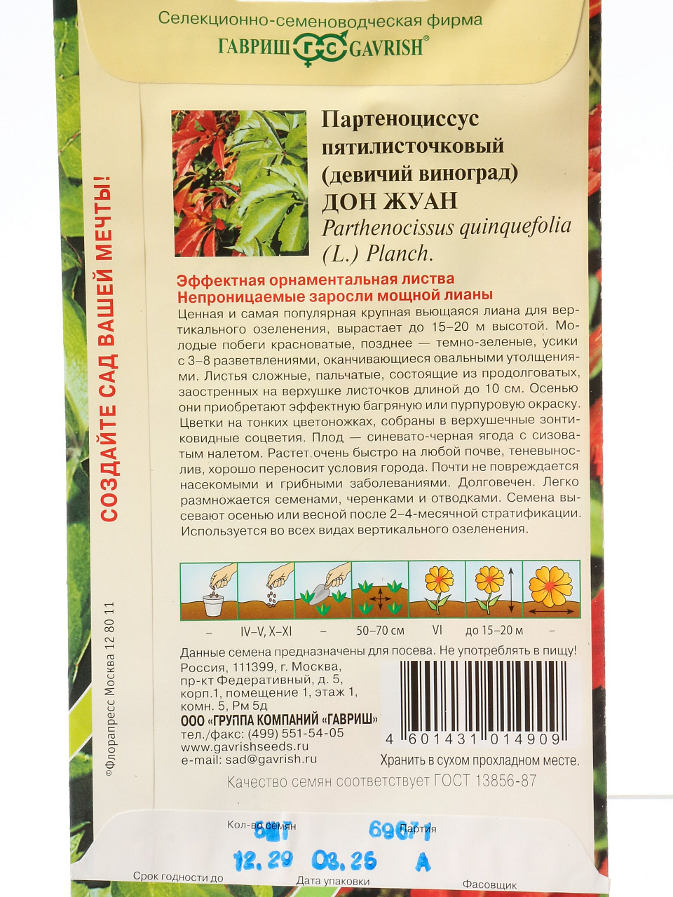 Вы можете приобрести «Семена Цветы, Девичий виноград, Дон Жуан, 5 шт, пятилисточковый, Партеноциссус, цветная упаковка, Гавриш» и другие товары в нашем интернет-магазине в Воронеже по низким ценам и с бесплатным самовывозом.