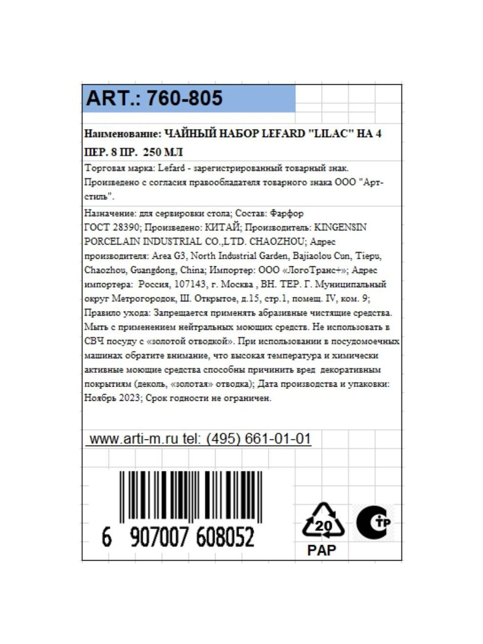 Вы можете приобрести «Набор чайный фарфор, 8 предметов, на 4 персоны, 250 мл, Lefard, Сирень, 760-805, подарочная упаковка» и другие товары в нашем интернет-магазине в Астрахани по низким ценам и с бесплатным самовывозом.
