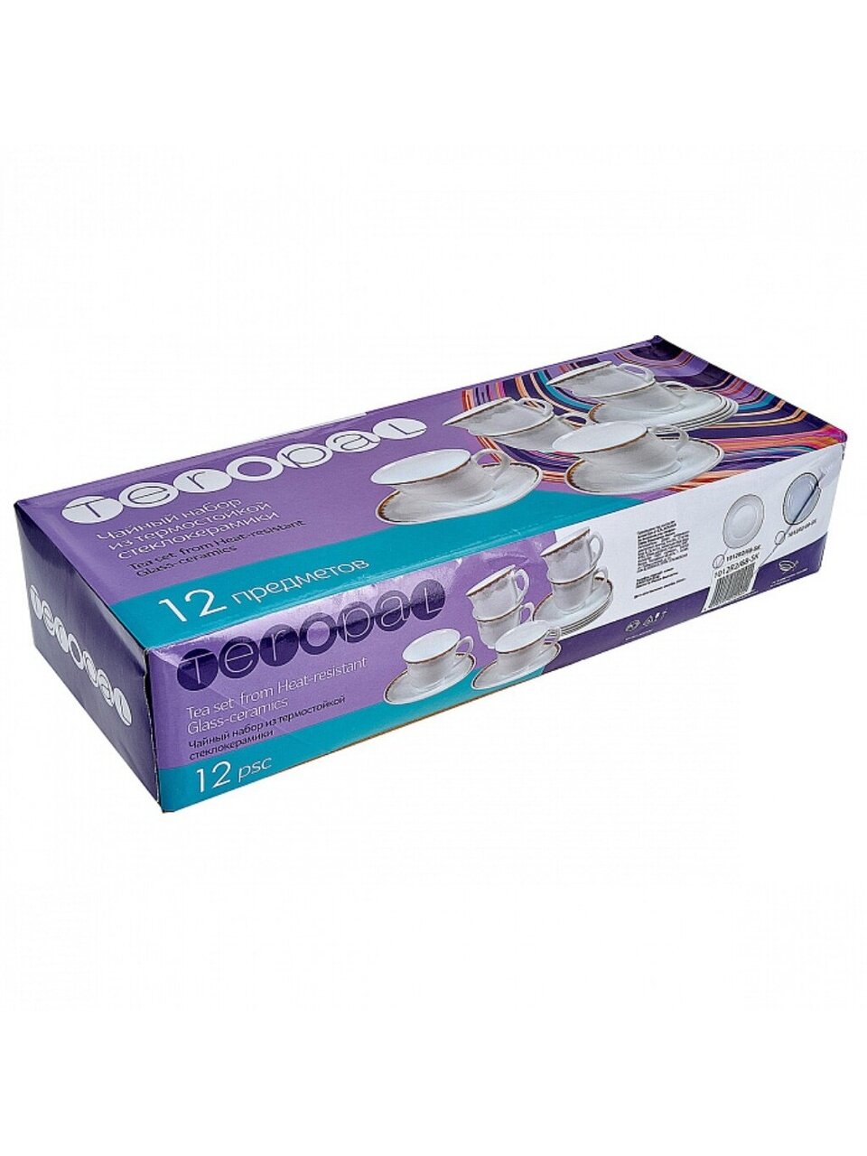Чайный набор из стеклокерамики на 6 персон Teropal Монро: элегантный сервиз 12 предметов с золотой каймой — идеальный подарок и украшение для вашего стола.