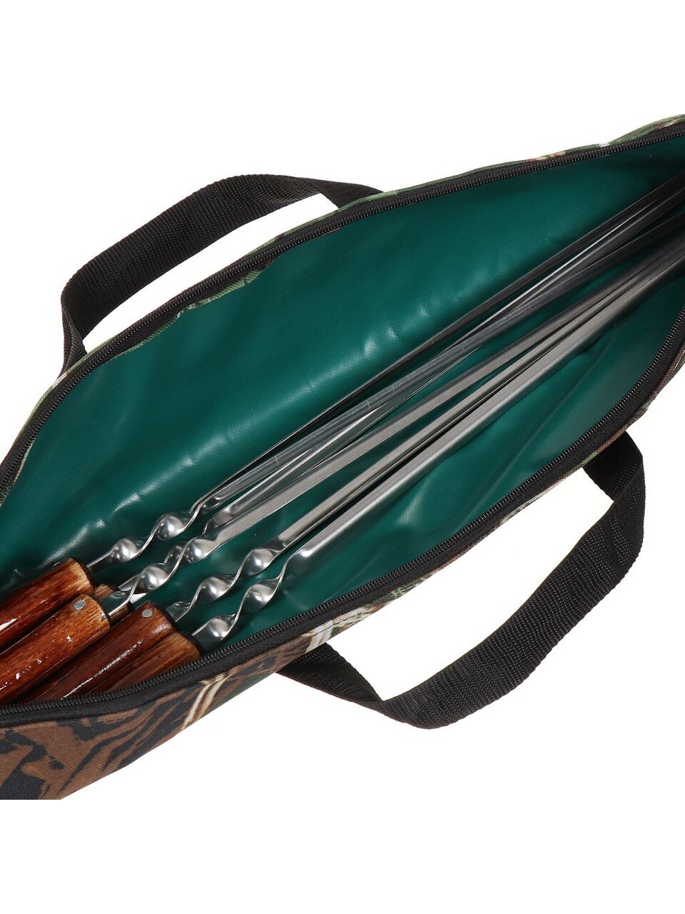 - Этот набор станет незаменимым помощником на пикнике, рыбалке или охоте. Он упакован в чехол, который защищает шампуры от повреждений и грязи.