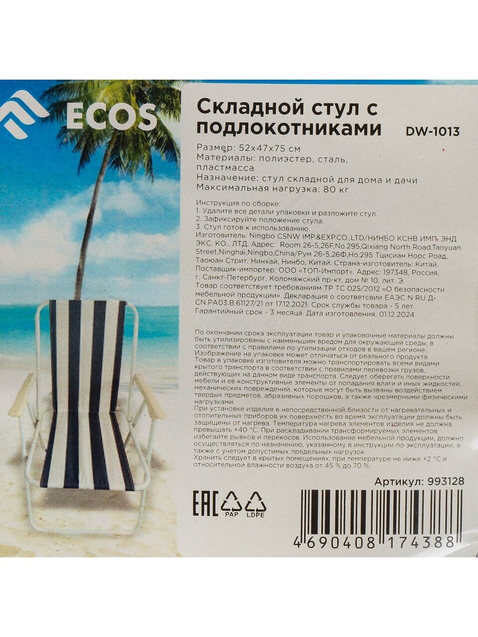 Если вы ищете, какое кресло выбрать для пикника или кемпинга, обратите внимание на Ecos DW-1013: оно оснащено удобными подлокотниками и высокой спинкой, что делает отдых более комфортным по сравнению с аналогичными моделями без подлокотников или с менее прочной конструкцией. Кресло легко чистится, не боится влаги, подходит для частого использования на улице. Как использовать кресло-шезлонг? Просто разложите на любом ровном месте — оно сразу готово к эксплуатации.