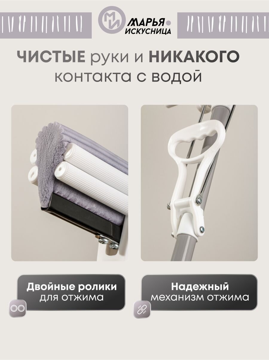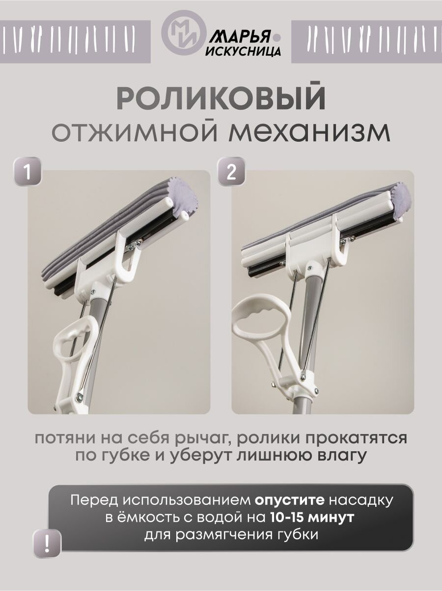 Отжим работает следующим образом: потяните на себя рычаг, ролики прокатятся по губке и удалят лишнюю влагу, благодаря чему ваши руки останутся сухими.