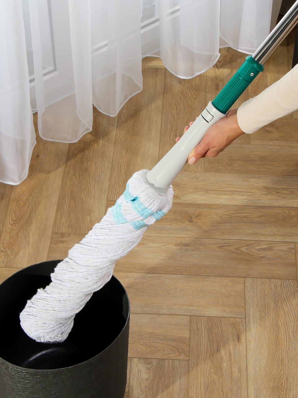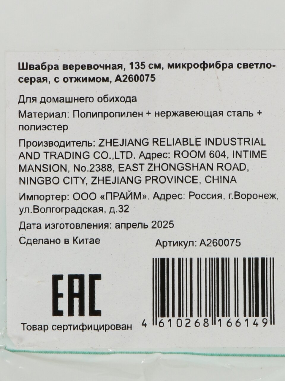 Швабра веревочная, 135 см, микрофибра светло-серая, с отжимом, A260075