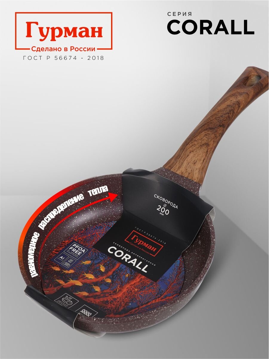 Литая сковорода Гурман Coral 20 см с гранитным антипригарным покрытием — решение для здорового питания без лишнего масла и пригорания, подходит для индукции и посудомоечной машины.