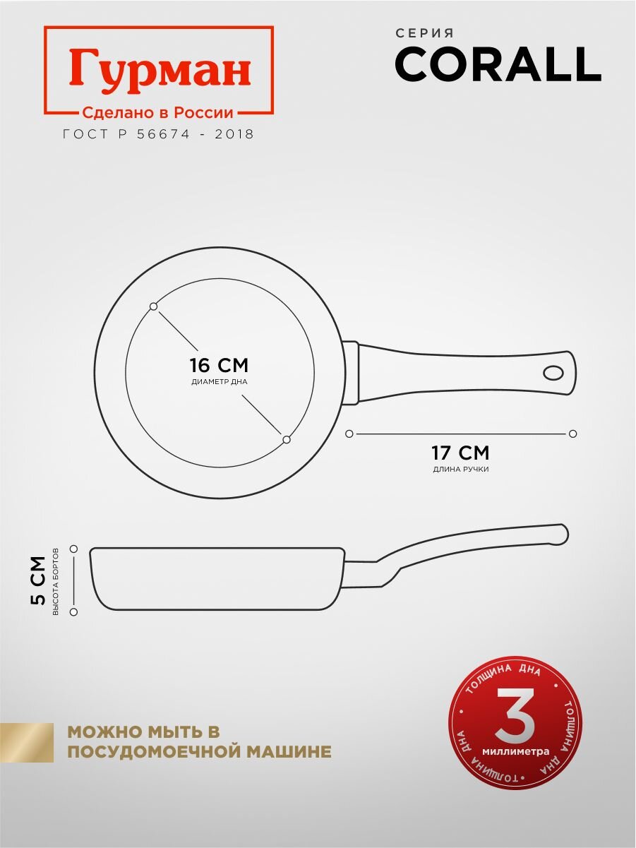 Диаметр дна составляет 16 см, общий диаметр — 20 см. Это удобно для стандартных конфорок и позволяет готовить порции на 1-3 человек.