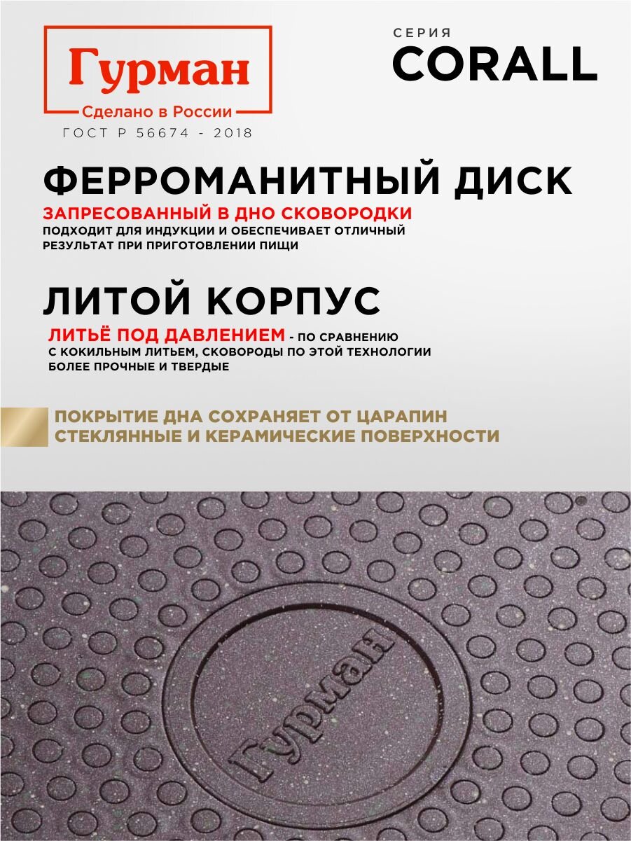 Как использовать сковороду Гурман Coral? Просто поставьте её на любую плиту: индукционную, газовую, стеклокерамическую или электрическую. Эта модель не требует специальной подготовки перед первым использованием, не боится частого мытья и устойчива к царапинам благодаря гранитному слою. В отличие от обычных алюминиевых сковород, литая конструкция дольше держит тепло и служит до 36 месяцев по гарантии. Подходит ли для подарка? Благодаря стильному красному цвету и современному дизайну, сковорода впишется в любой интерьер кухни.