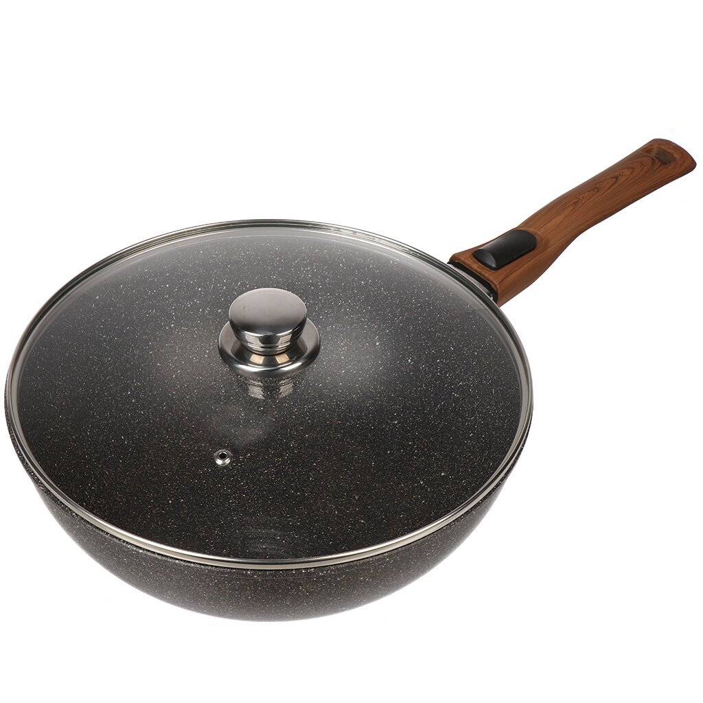 Сковорода-вок Гардарика Мегалит 18, 28 см: антипригарное гранитное покрытие, литой алюминий, крышка и съемная ручка — идеальный выбор для кухни и дачи.