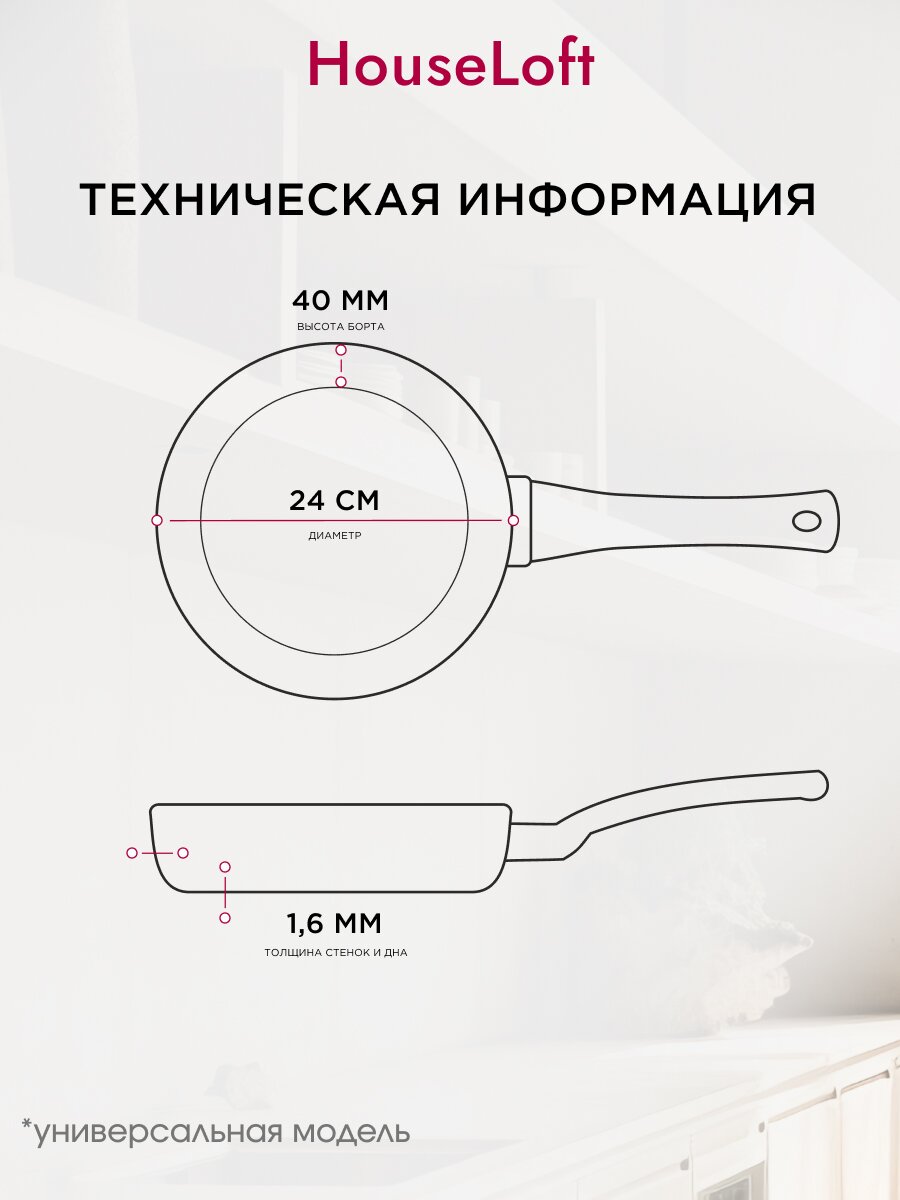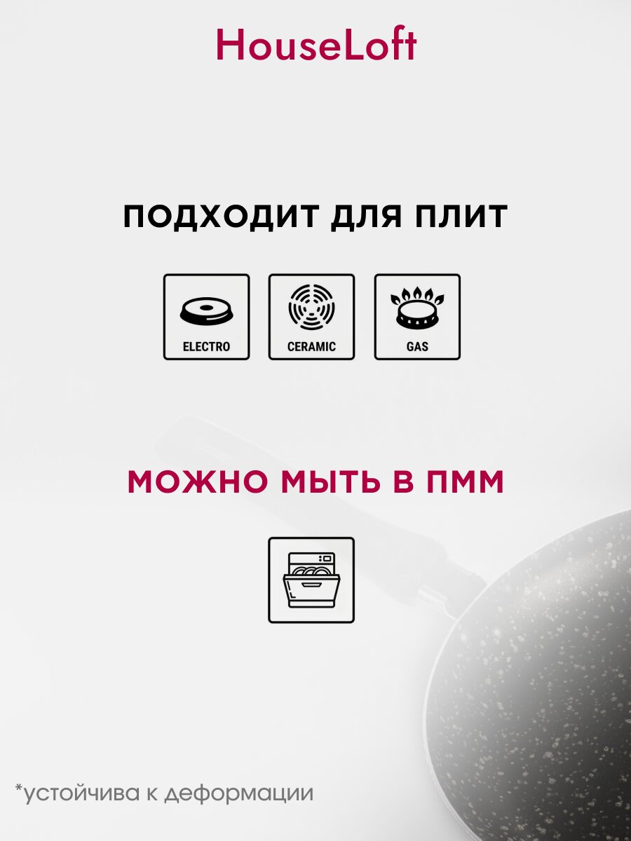 Сковорода HouseLoft 24 см совместима с газовыми, электрическими и стеклокерамическими плитами. Для индукционных плит не подходит.