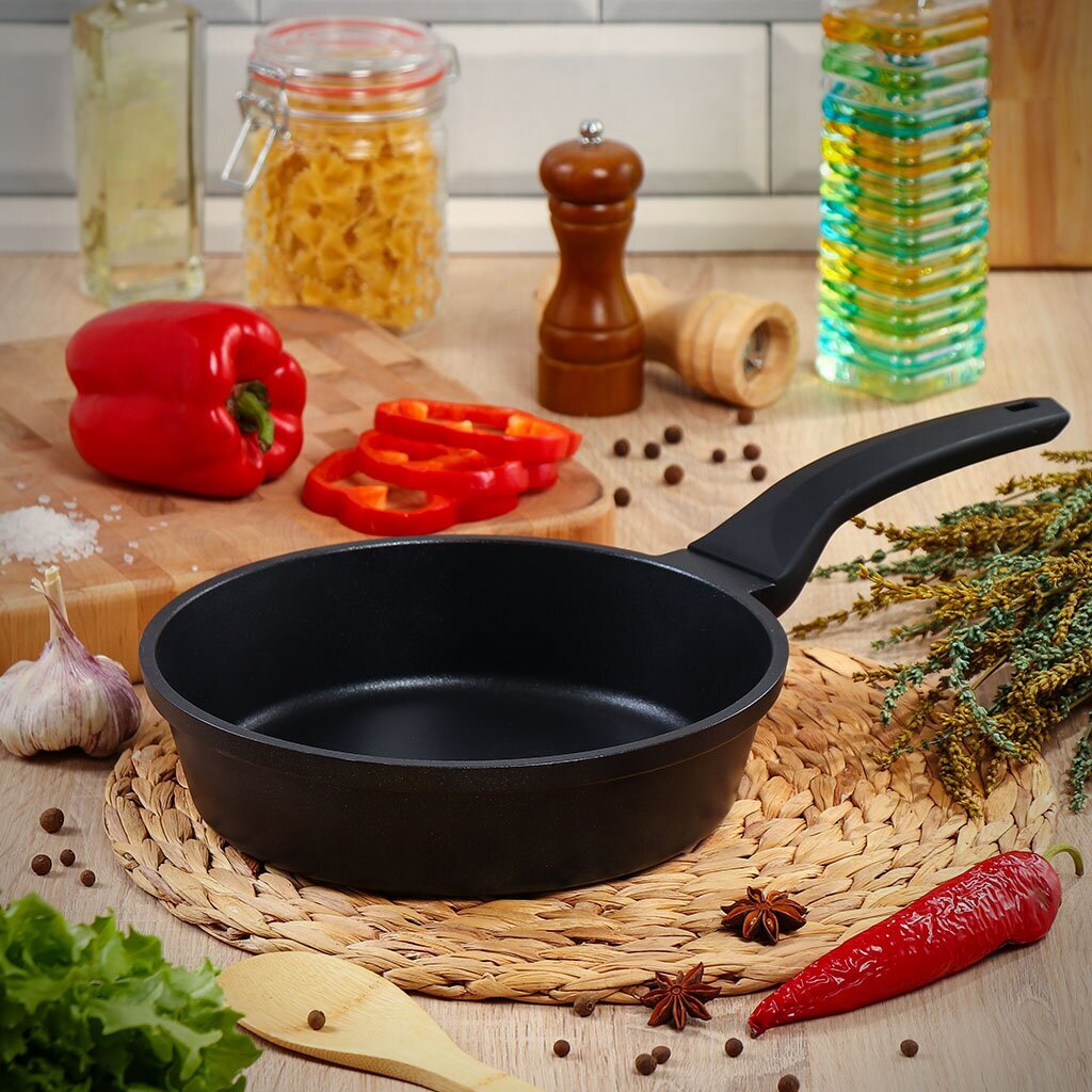 - Оптимальный размер 24 см, литой алюминий, усиленное дно 4 мм — прочность и равномерный нагрев до 36 месяцев гарантии