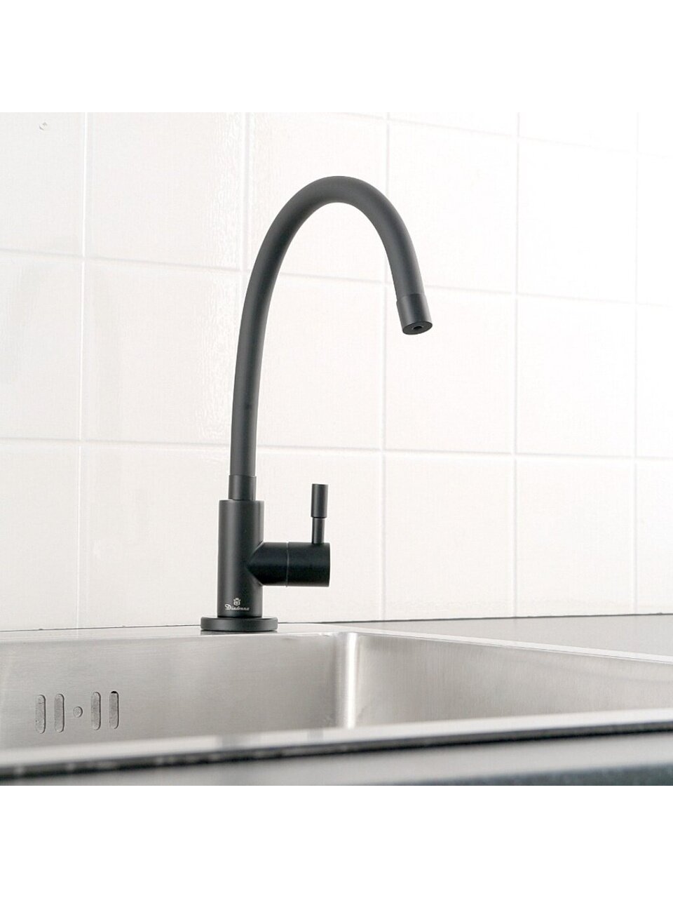 В отличие от аналогов с пластиковым корпусом, Diadonna выполнен из нержавеющей стали — материал устойчив к коррозии и сохраняет презентабельный вид даже при ежедневном использовании. Черный матовый цвет и современный стиль гармонируют с большинством кухонных интерьеров. Для установки требуется всего одно монтажное отверстие диаметром 41 мм, а стандарт подключения шланга — 1/2", что облегчает самостоятельную установку. Если вы спрашиваете, подходит ли смеситель для фильтрованной воды и как его подключить — в комплекте уже есть переходник для фильтра.