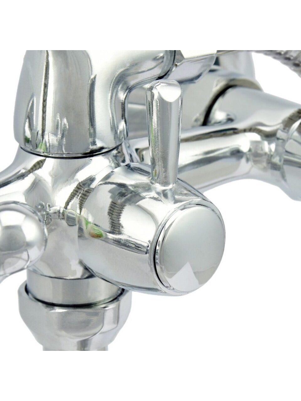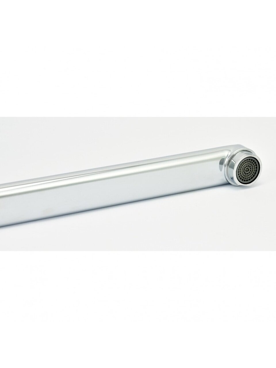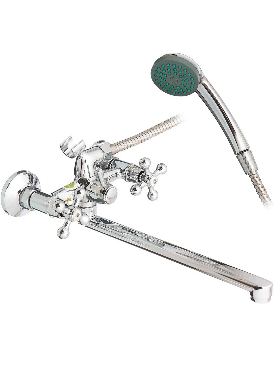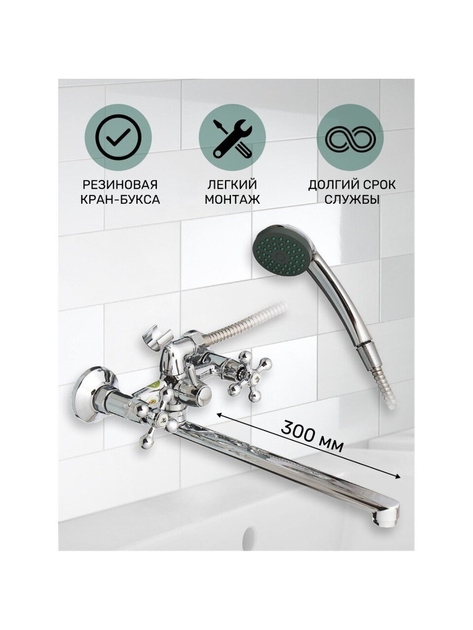 Длина поворотного излива составляет 30 см, что удобно для наполнения ванны и мытья, а также для использования душа благодаря комплектной лейке.