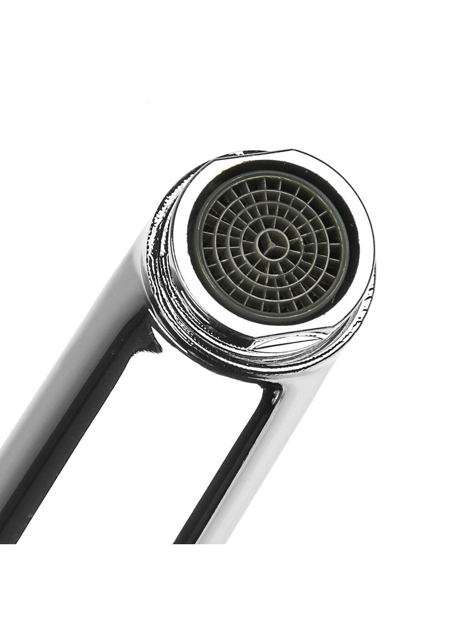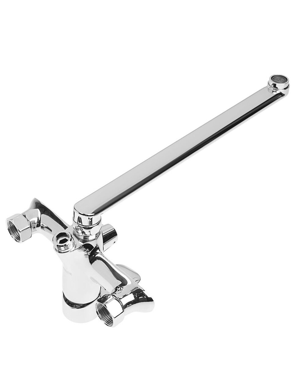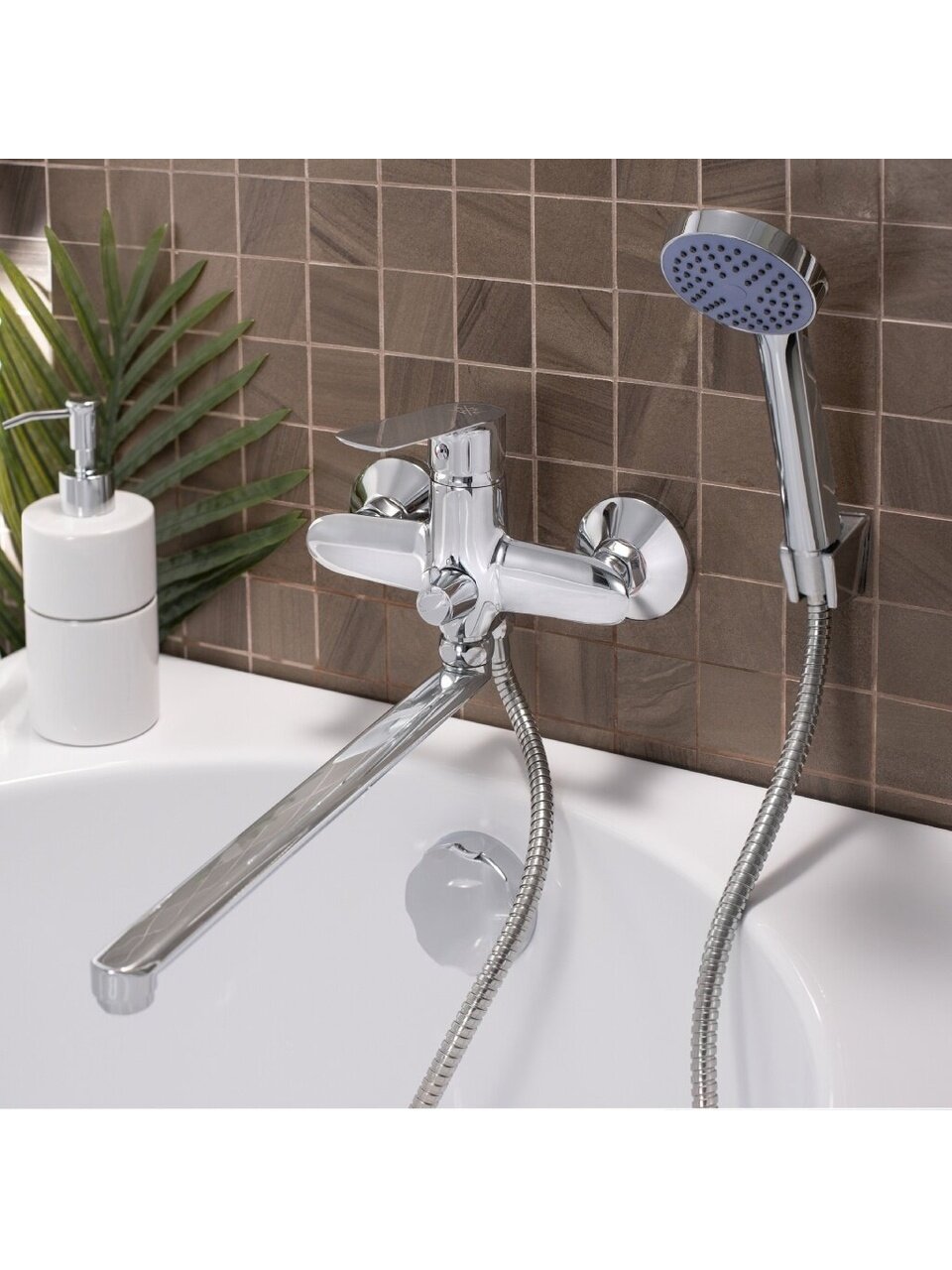 - Длинный поворотный излив 35 см из цинкового сплава с глянцевой хромированной поверхностью — удобно для наполнения ванны и мытья