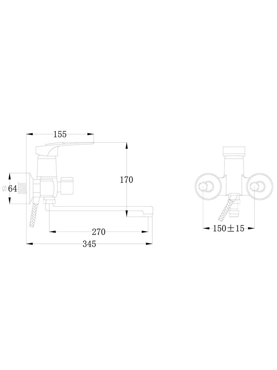 Длина излива — 30 см, межосевое расстояние — 150 мм. Модель рассчитана на монтаж в типовых ванных комнатах с двумя отверстиями.