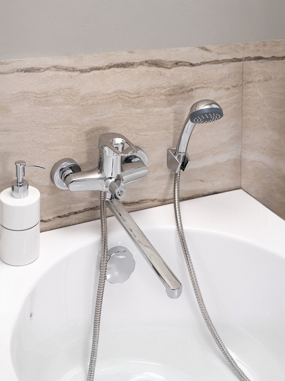 Многие спрашивают, как выбрать смеситель для ванны с душем, который не подведет при интенсивной эксплуатации. В SL55-006E установлен керамический картридж — он обеспечивает плавное переключение потоков воды без протечек. В отличие от аналогов с коротким изливом, эта модель идеально подойдет для стандартных и просторных ванн, а благодаря наличию лейки и аэратора расход воды остается экономичным. Если вы ищете, какой смеситель лучше для дачи или квартиры, обратите внимание на простоту монтажа: вертикальное настенное крепление и стандартная подводка 1/2" позволяют быстро установить устройство без вызова мастера.