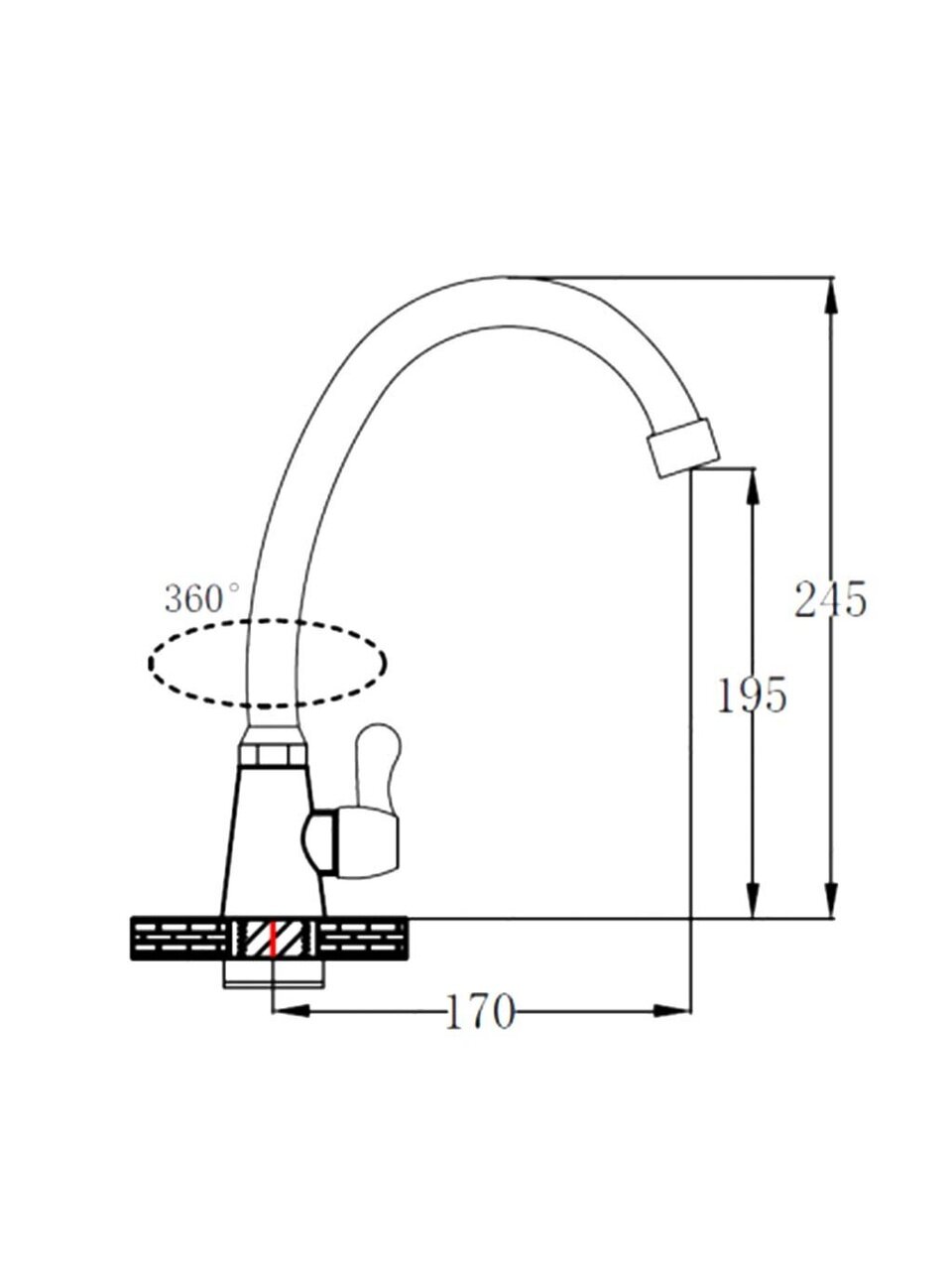 Длина излива — 17 см, высота — 19,5 см. Такой размер оптимален для большинства стандартных и глубоких кухонных моек, обеспечивая удобство при мытье посуды и наборе воды.