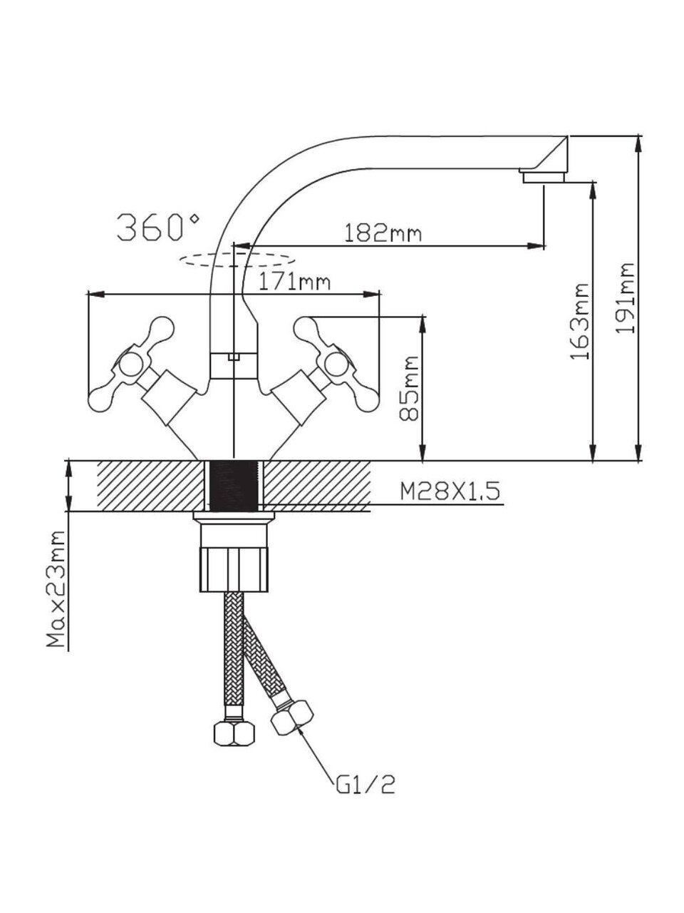 Смеситель оснащён двухвентильным поворотным управлением с керамической кран-буксой, что обеспечивает плавное переключение и долговечность механизма.