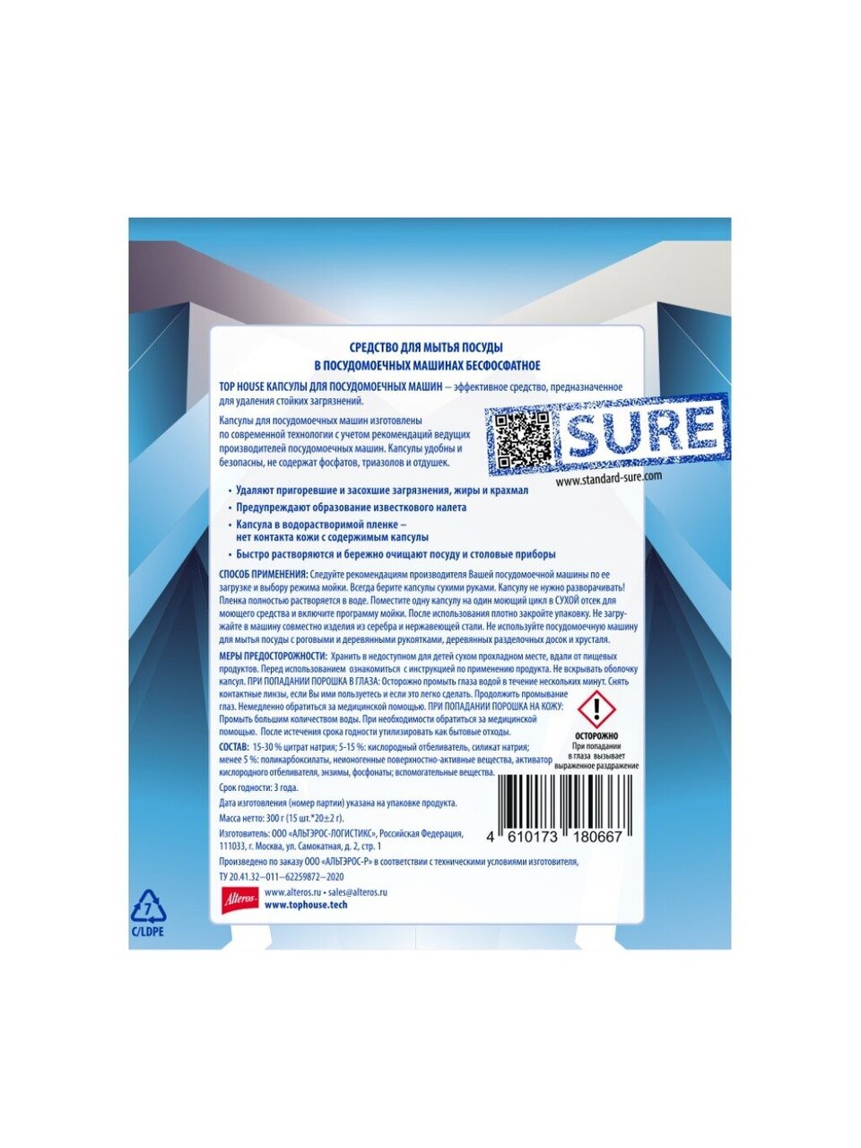 Капсулы Top House - эффективное средство, предназначенное для удаления стойких загрязнений. Порошок в капсулах для посудомоечных машин изготовлен по современной технологии с учетом рекомендаций ведущих производителей посудомоечных машин.