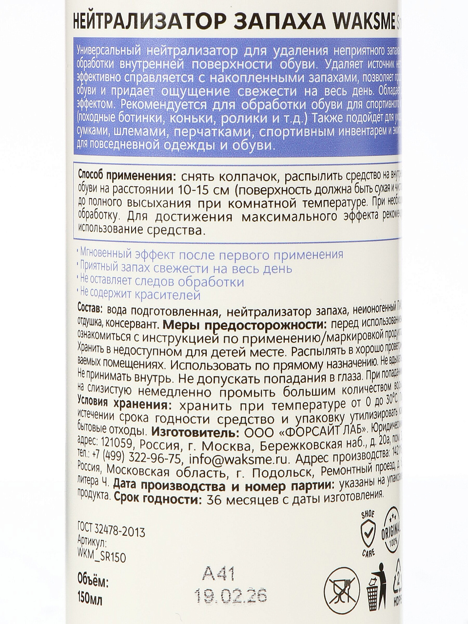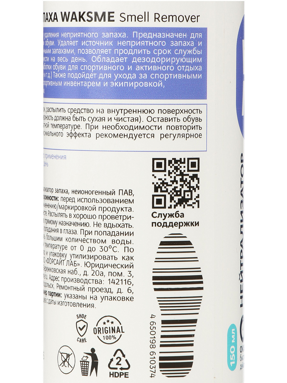 Нейтрализатор запахов WaksMe Smell Remover 150 мл — быстрое решение проблемы неприятного запаха обуви и ног. Подходит для дома, спорта и активного образа жизни.