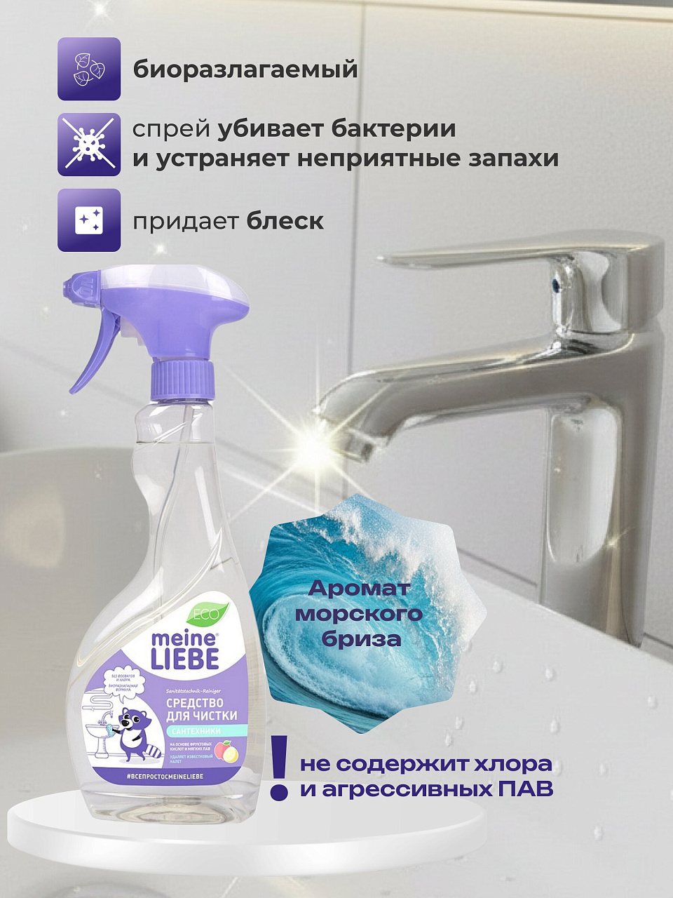 Высокоэффективное средство для чистки ванн, раковин, душевых кабин, эмалированной сантехники, хромированных кранов, унитазов, кафельных покрытий и пластиковых панелей. Придает блеск. Устраняет неприятные запахи. Препятствует размножению бактерий. Со свежим ароматом морского бриза.