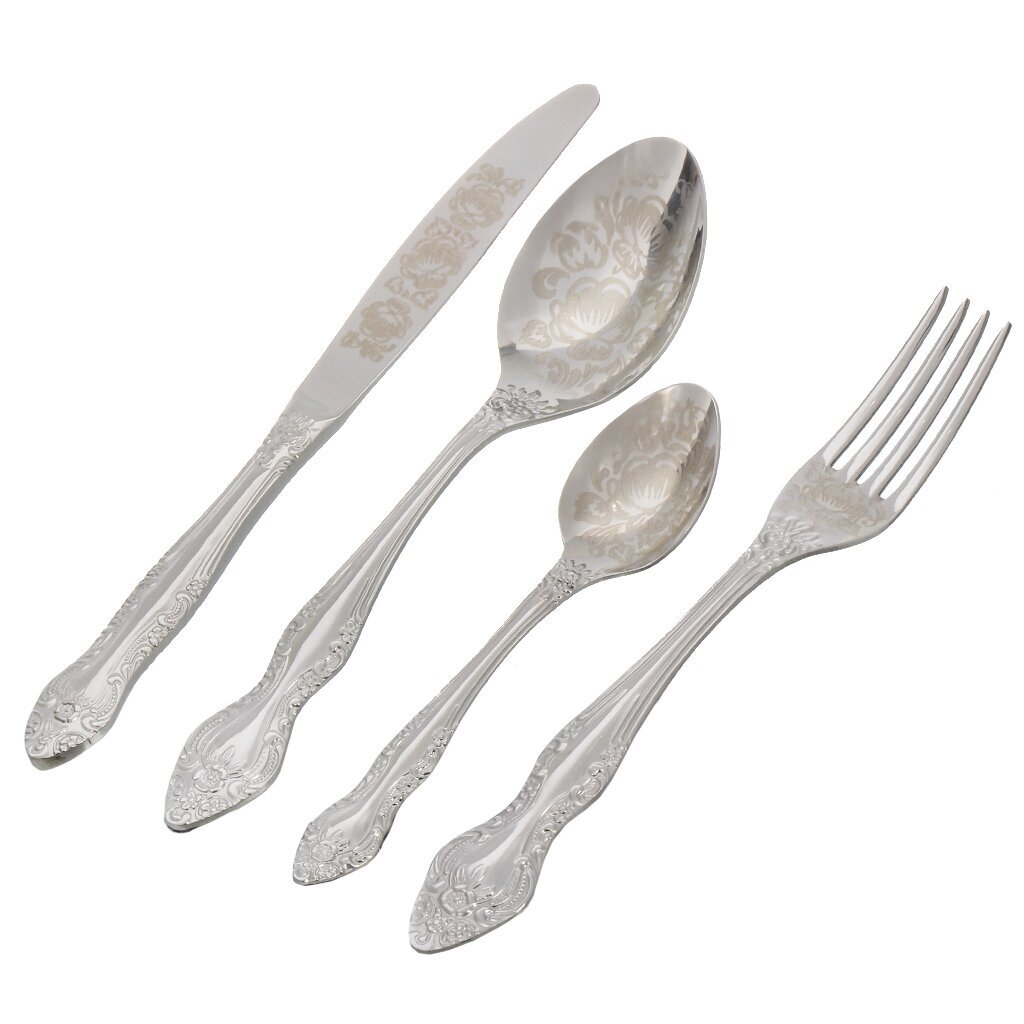 В комплекте 24 столовых прибора из нержавеющей стали, рассчитанных на 6 персон: по 6 ложек, вилок, ножей и чайных ложек. Длина каждого прибора — 21,5 см.
