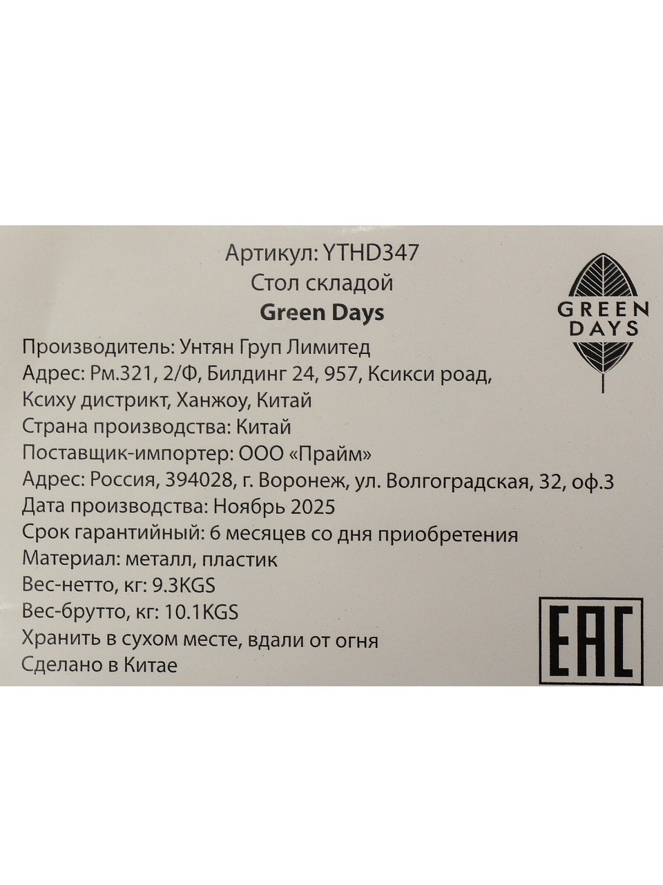 Стол садовый металл, Green Days, 180х68х74 см, прямоугольный, пластиковая столешница, белый, YTHD347, 100 кг