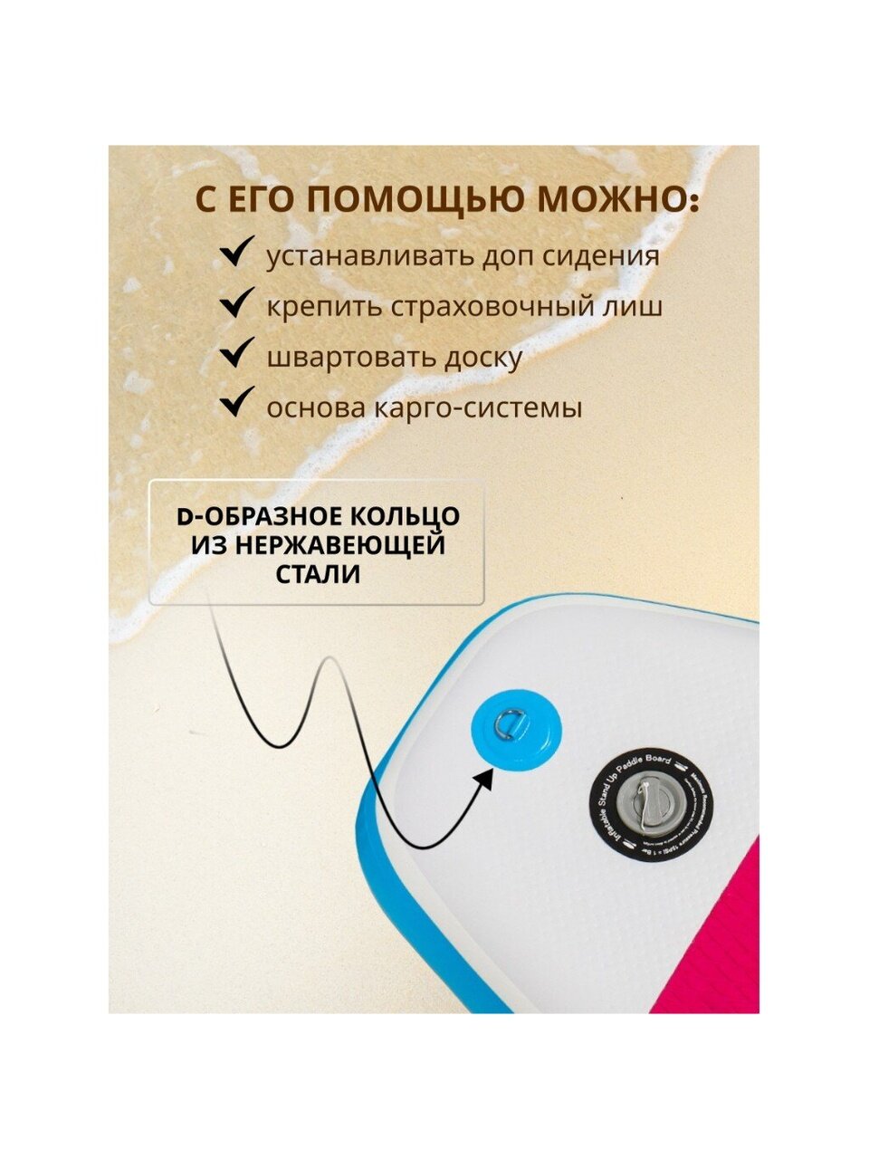 - D-образные кольца из нержавеющей стали (D 3 мм, D 4 мм). Это важный элемент, увеличивающий комфорт использования и функционал САП-борда. Кольца позволяют устанавливать специальные САП сиденья, крепить страховочный лиш, они же являются основой для карго системы, а также кольцо на носовой части позволяет швартовать доску или подвешивать её для высушивания.