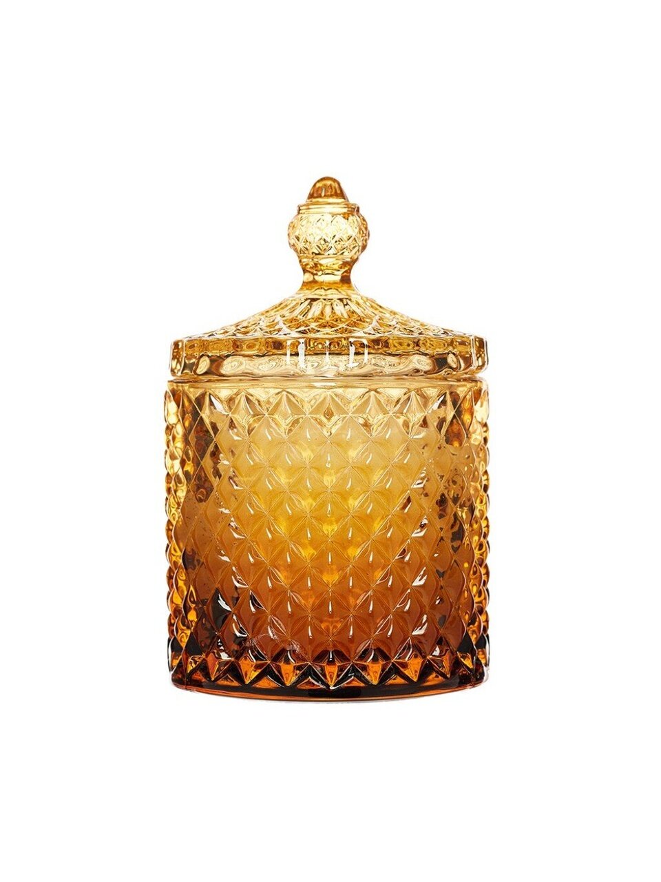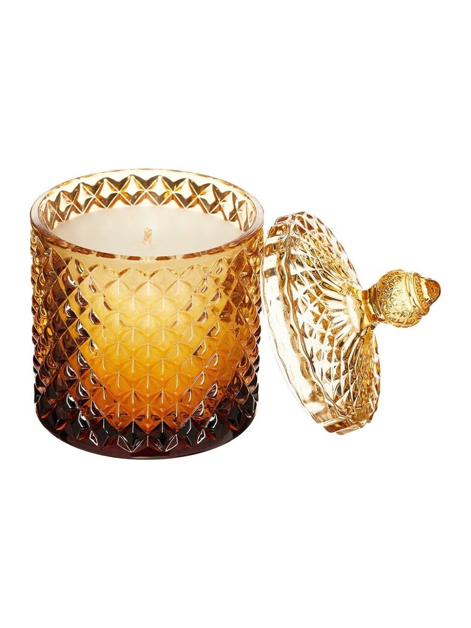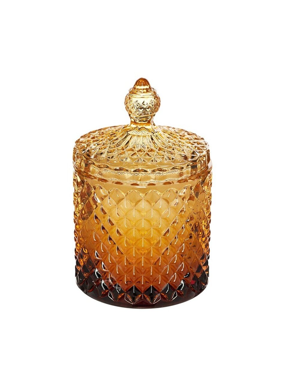 Высота — 10 см, диаметр — 12 см. Изготовлена из парафина, хлопкового фитиля и амберового стекла с крышкой.