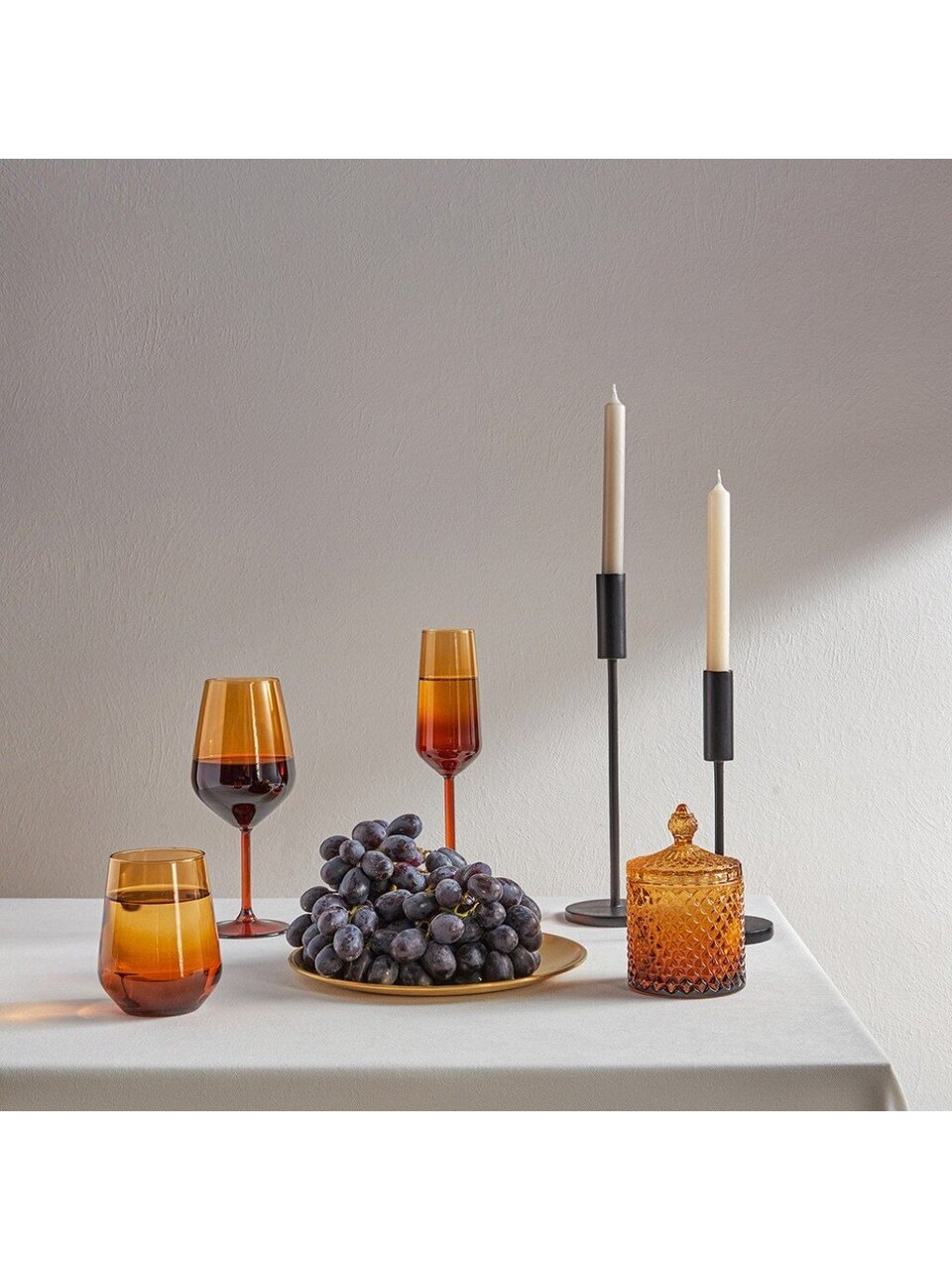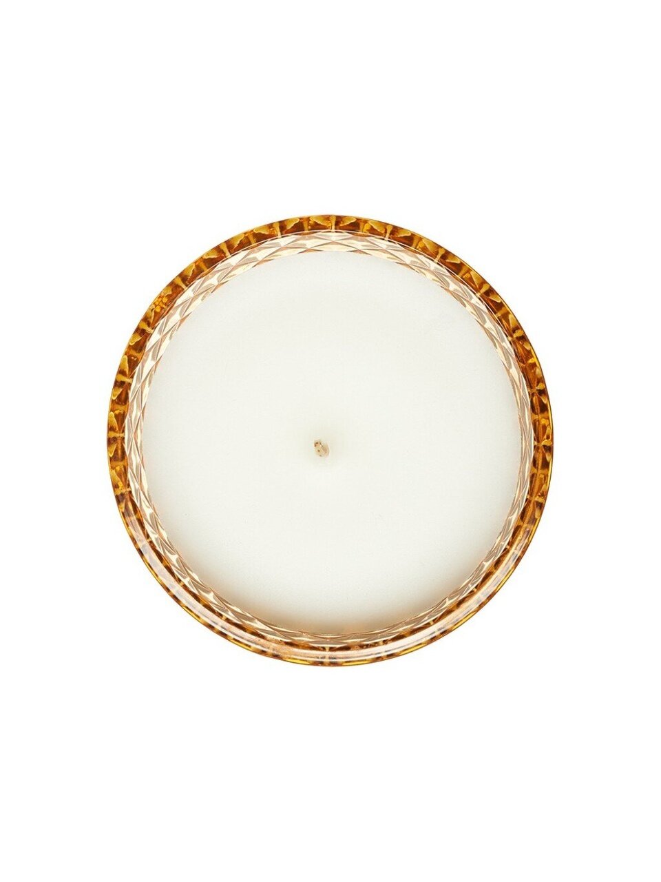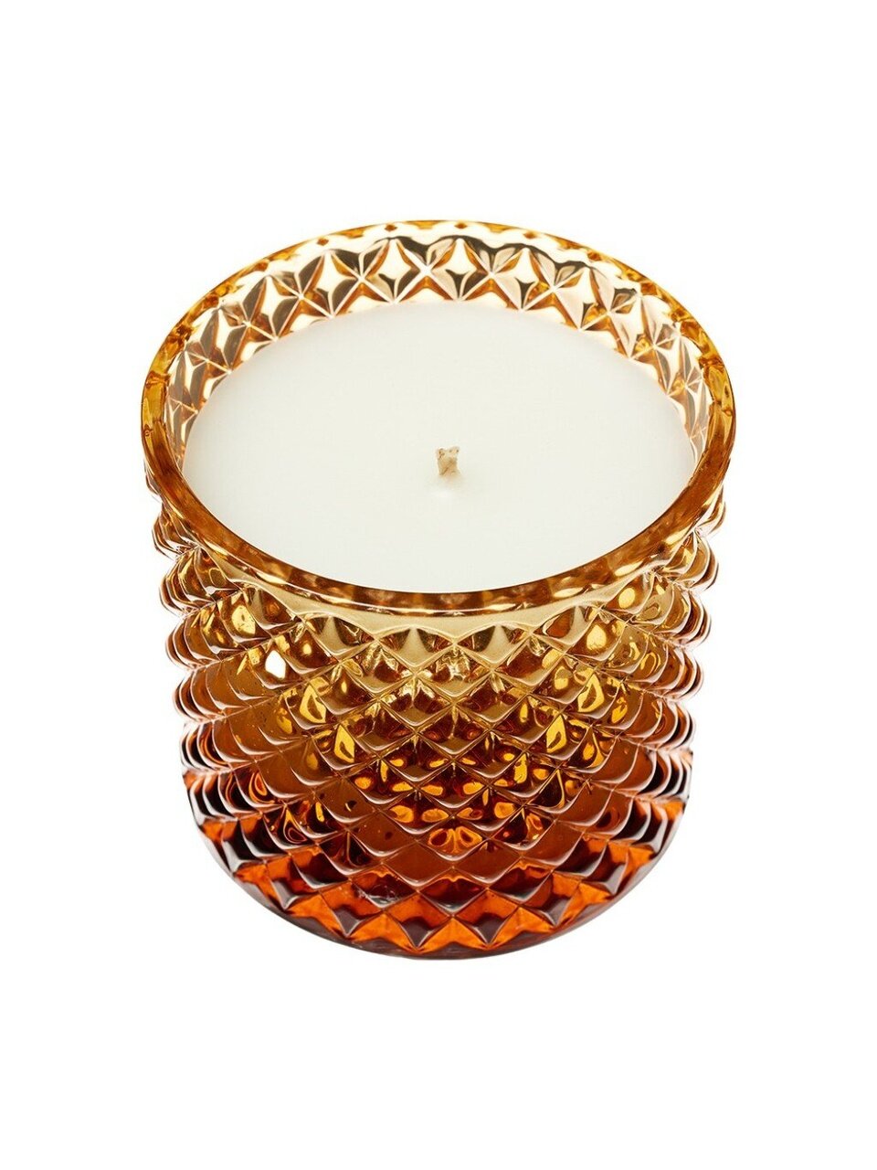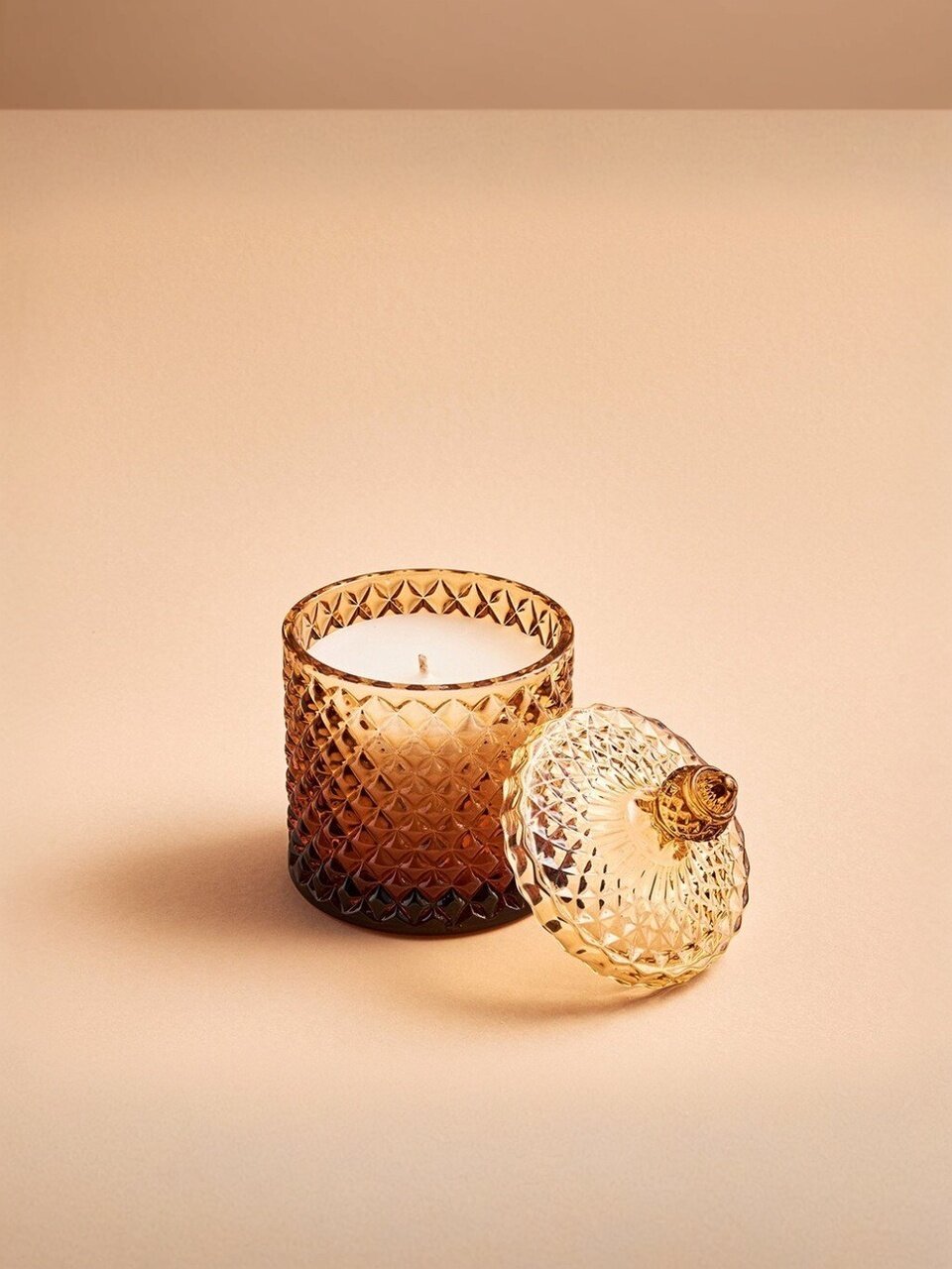 Высота — 10 см, диаметр — 12 см. Изготовлена из парафина, хлопкового фитиля и амберового стекла с крышкой.