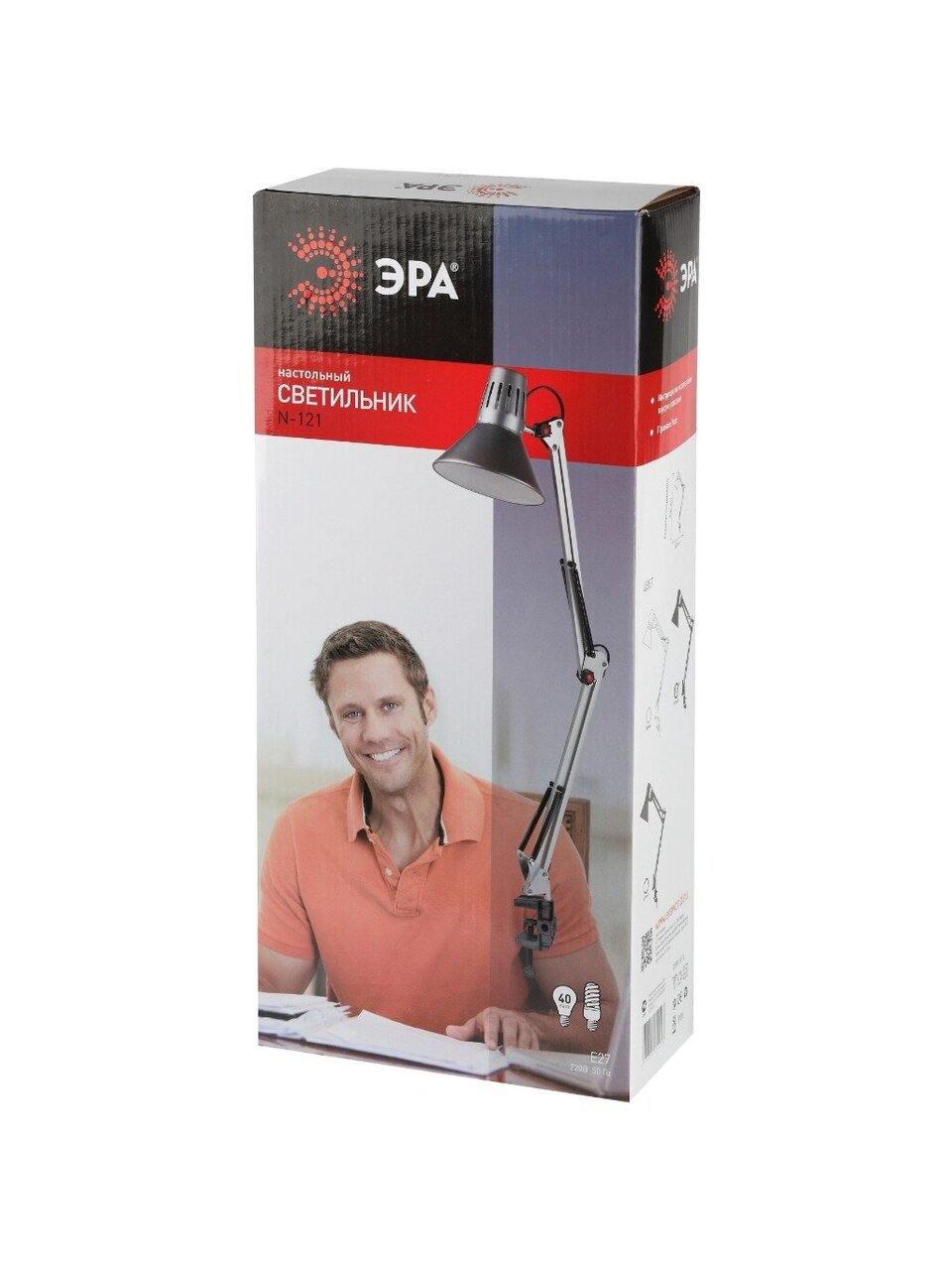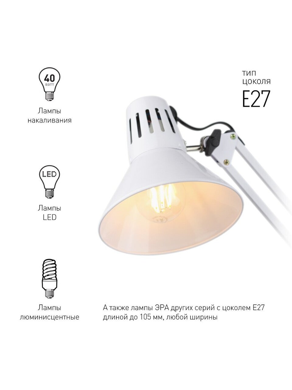 Настольный светильник ЭРА N-121-E27-40W-W классического дизайна может использоваться с разными источниками света - лампой накаливания, компактной люминесцентной лампой (КЛЛ) или светодиодной (LED) лампой. Выключатель на проводе. Крепится на струбцину. Высота плафона регулируется двухсекционной сгибающейся стойкой, направление света - поворотом и наклоном плафона в любом направлении.