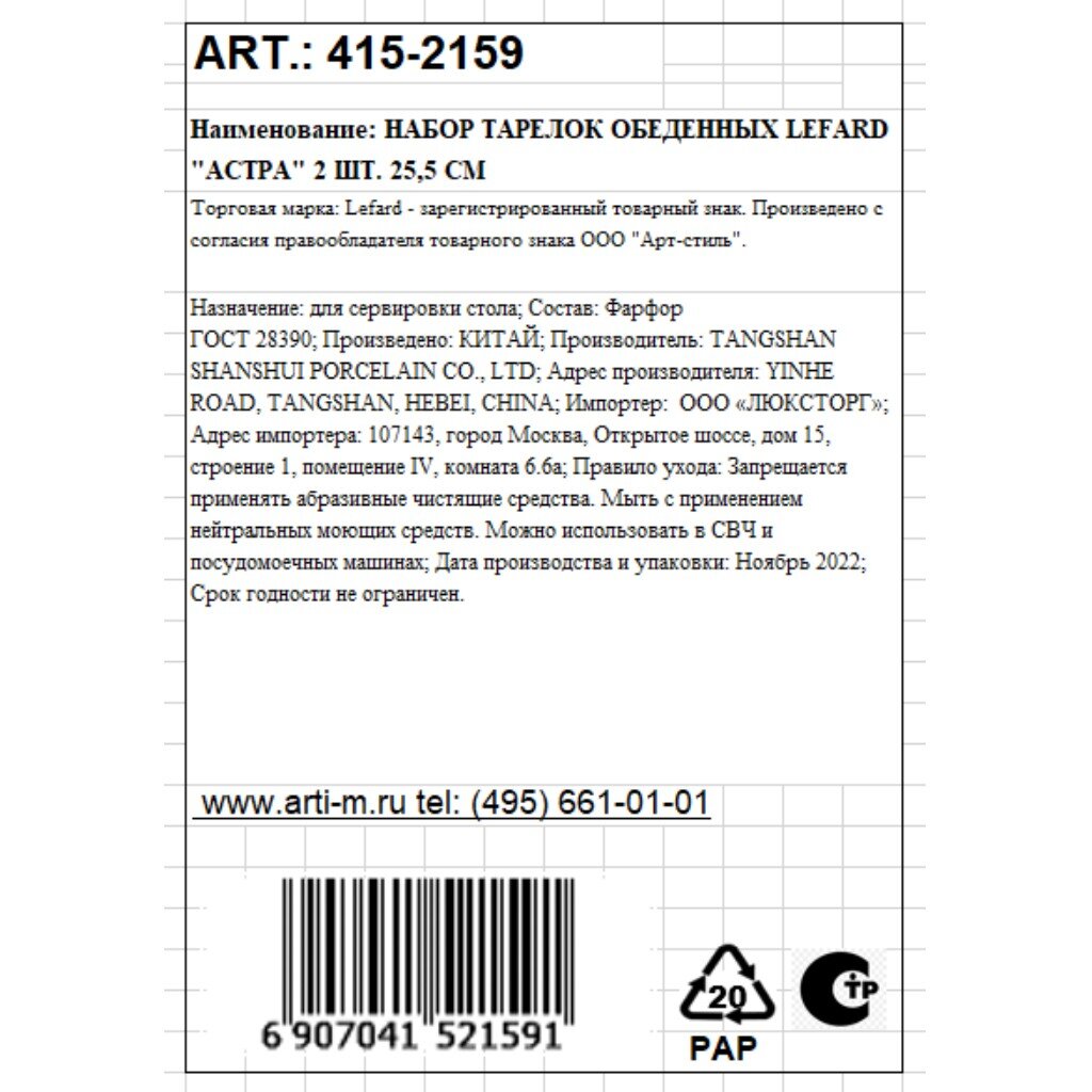 Вы можете приобрести «Набор тарелок обеденный, фарфор, 2 шт, 25.5 см, круглый, Астра, Lefard, 415-2159» и другие товары в нашем интернет-магазине в Брянске по низким ценам и с бесплатным самовывозом.