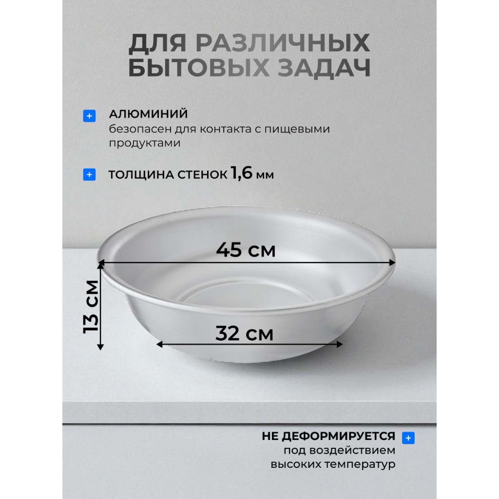 - Таз из пищевого алюминия имеет прочные и толстые стенки, что обеспечивает долговечность изделия. Такой таз будет служить вам долгое время без потери своих качеств.