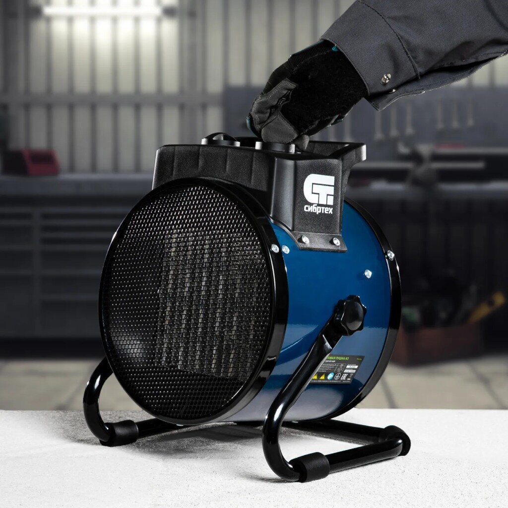 Тепловая пушка Сибртех К3 с керамическим нагревательным элементом работает от сети 230 В и имеет три режима: вентиляция без нагрева, нагрев с мощностью 1500 или 3000 Вт. Предназначена для обогрева или вентиляции нежилых помещений площадью до 30 кв. м, просушки различных поверхностей, например, бетонных стяжек, окрашенных или оштукатуренных стен.