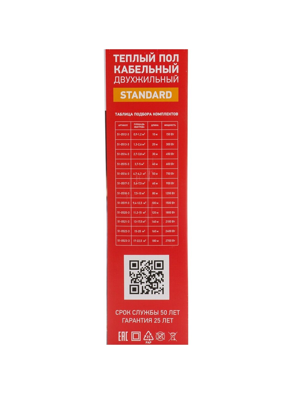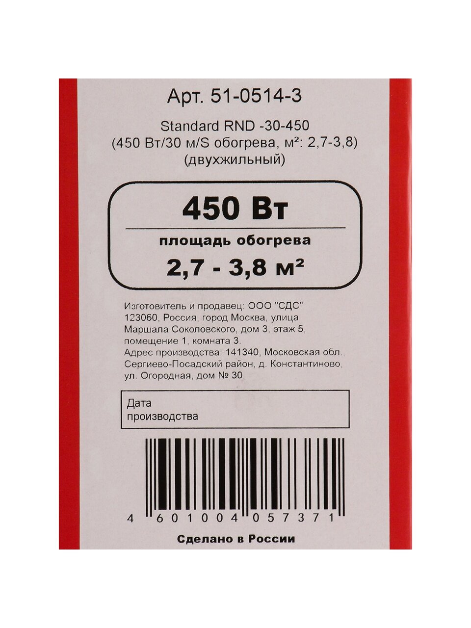 Длина кабеля — 30 м, рассчитан на обогрев 2.7-3.8 м², мощность — 450 Вт. Это оптимально для ванной, кухни, небольших комнат и зонального отопления.