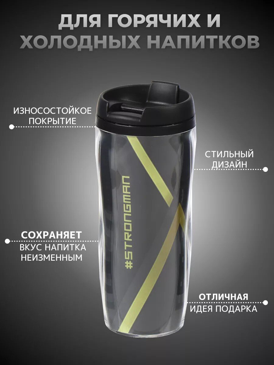 Объем — 0.38 л (округленно 0.4 л), горловина широкая, крышка с отверстием для питья. Это удобно для питья на ходу и предотвращает проливание напитка.