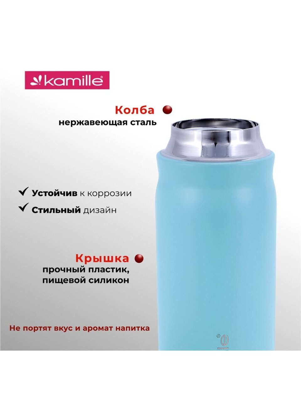 Термос Kamille 0.5 л — это сочетание прочности, эргономики и современного дизайна. Корпус и колба выполнены из высококачественной нержавеющей стали, что гарантирует долговечность и устойчивость к ударам. Благодаря узкой горловине напитки дольше сохраняют температуру, а крышка-защёлка обеспечивает герметичность даже в движении. Вы ищете, какой термос лучше выбрать для города или похода? Эта модель оптимальна по размеру — легко помещается в рюкзак или автомобильный подстаканник, не протекает и не впитывает запахи.