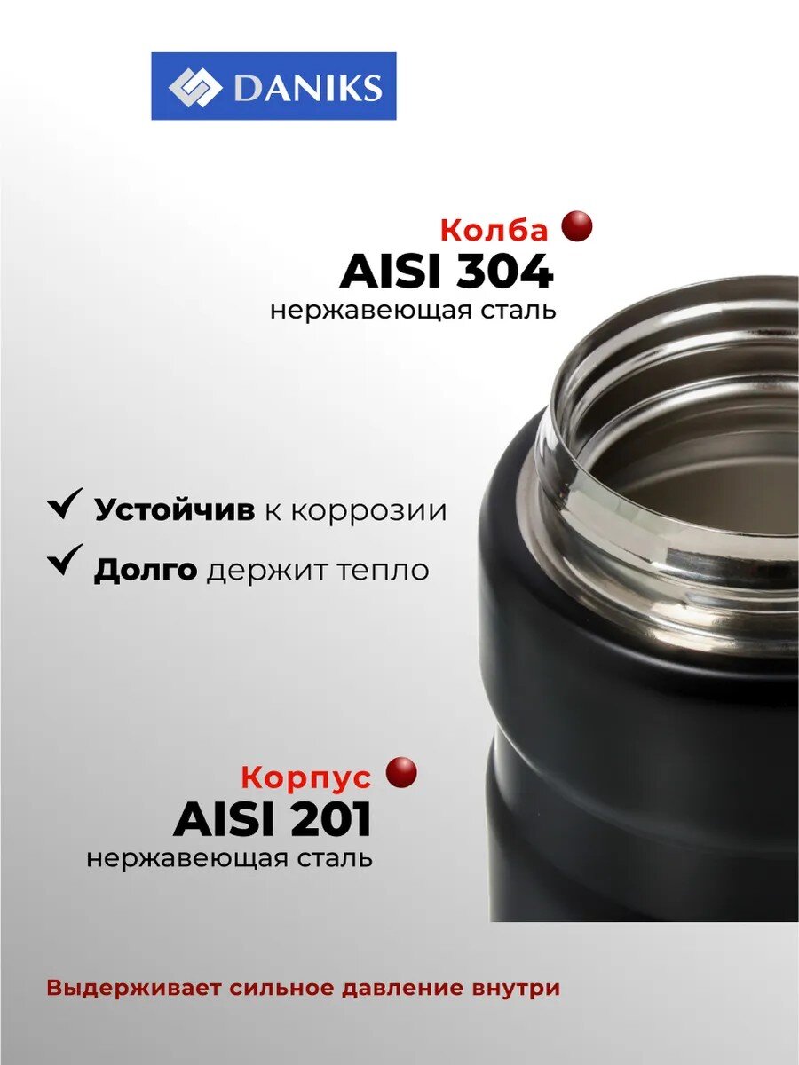 В отличие от пластиковых или стеклянных аналогов, стальной термос Daniks не бьётся, не впитывает запахи и легко очищается даже после жирных блюд. Крышка с резьбой плотно закрывается, предотвращая протечки в рюкзаке. Часто спрашивают: подходит ли для первых и вторых блюд? Да, благодаря широкой горловине и объёму 0.5 л термос удобен для разных типов еды, а не только напитков. Для кого выбрать этот термос? Для тех, кто ценит мобильность, безопасность материалов и простоту ухода.