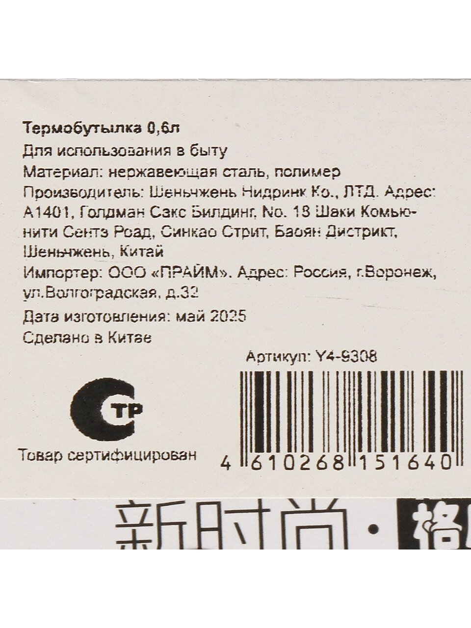 Термобутылка нержавеющая сталь, 0.6 л, бежевая, Y4-9308