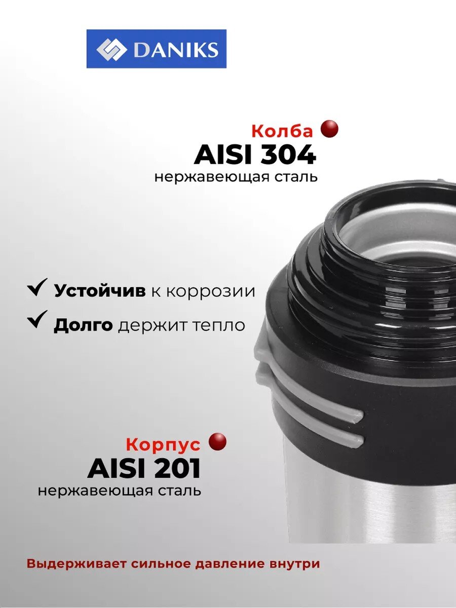 В отличие от пластиковых аналогов, стальной термос Daniks безопасен для здоровья, не содержит вредных примесей, не окрашивается и не трескается даже при интенсивном использовании. Как использовать термос для разных напитков? Просто налейте чай, кофе или воду — универсальная горловина и крышка с клапаном обеспечивают герметичность и сохраняют вкус. Подходит ли для длительных поездок и походов? Да, благодаря объему 2 литра и прочному корпусу с ручкой термос удобно брать с собой на природу, в офис или в дорогу.
