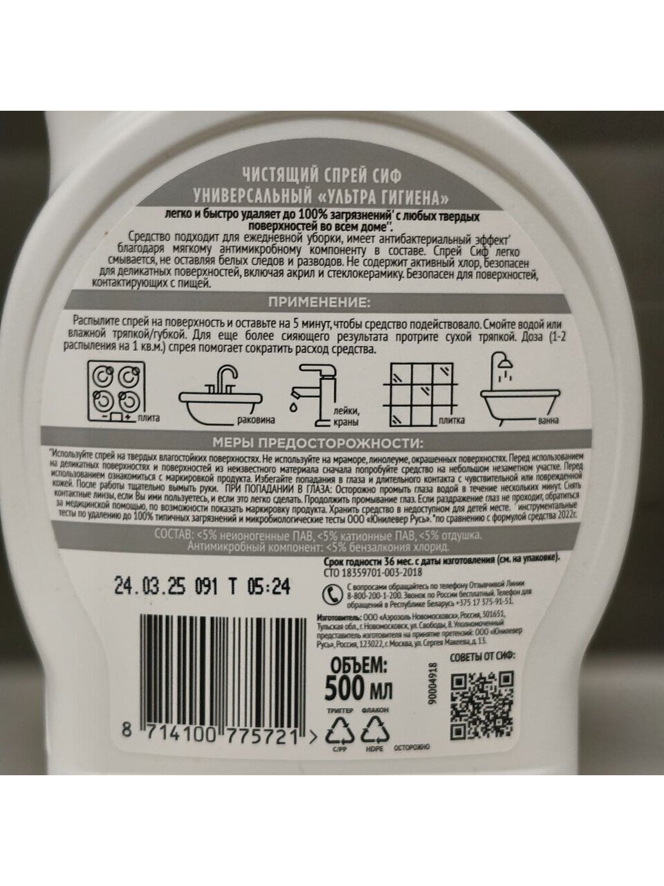 Инновационная формула спрея Cif помогает легко и быстро отчистить грязь с поверхностей. Подходит для удаления кухонных загрязнений (жирные пятна, пригоревшая еда), загрязнений в ванной (мыльный и известковый налет), очищения и обработки других твердых поверхностей в доме. Обладает дезинфицирующим эффектом, убивает до 99.9% бактерий, оставляя поверхности гигиенически чистыми. Перед применением обязательно прочтите инструкцию и соблюдайте осторожность при использовании средства.
