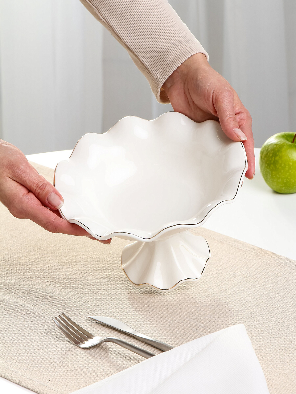 Фарфоровая ваза для фруктов Bonjart «Золотая линия» — это сочетание классики и современных трендов сервировки. Благодаря гладкой глазури и прочному фарфору она устойчива к царапинам, легко моется и не впитывает запахи. Многие спрашивают: «Как выбрать вазу для фруктов, чтобы она подходила к разной посуде?» — изделие в белоснежном цвете с золотистой отделкой гармонирует с любой сервировкой, от минимализма до классики.