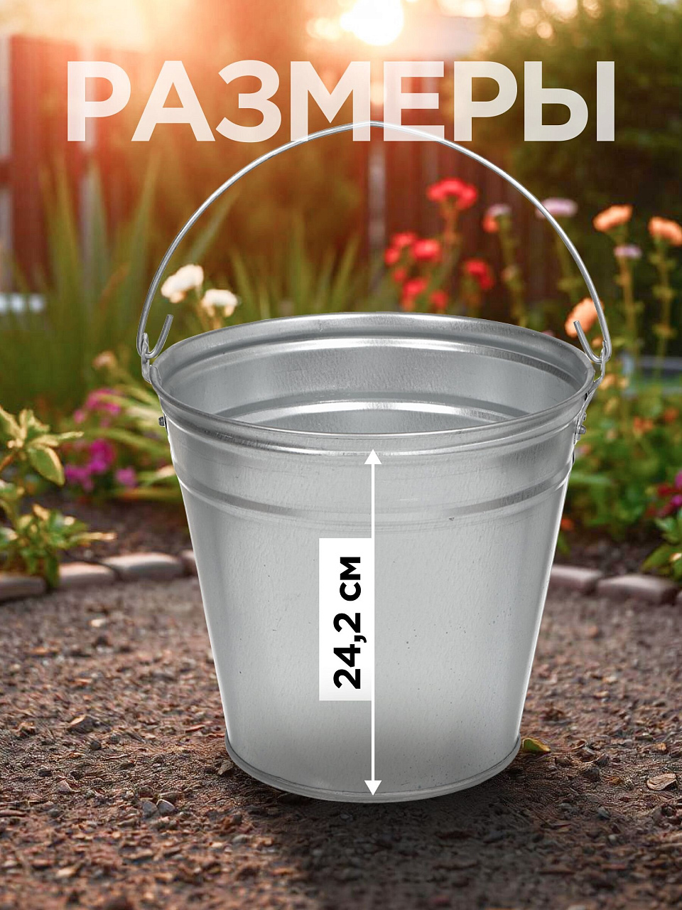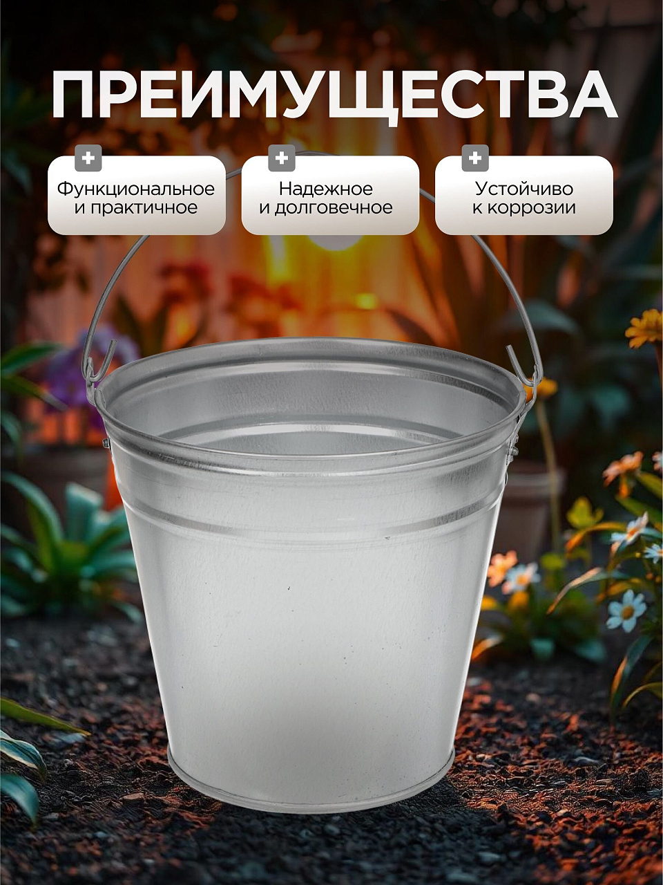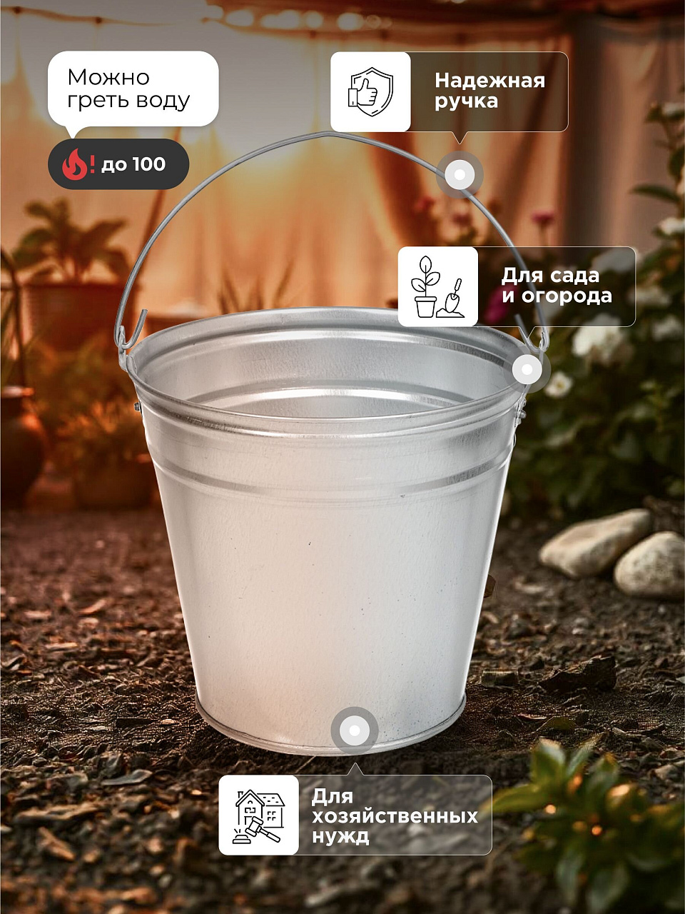 Оцинкованное хозяйственное ведро подойдет для бытовых нужд и строительства. От коррозии металл надежно защищен толстым слоем цинка. Жесткая металлическая рукоять оптимальна для переноски и надежно закреплена в петлях. Дополнительная обкатка повышает жесткость конструкции. В данном ведре можно греть воду. Максимальная температура выдержки - 100°С.